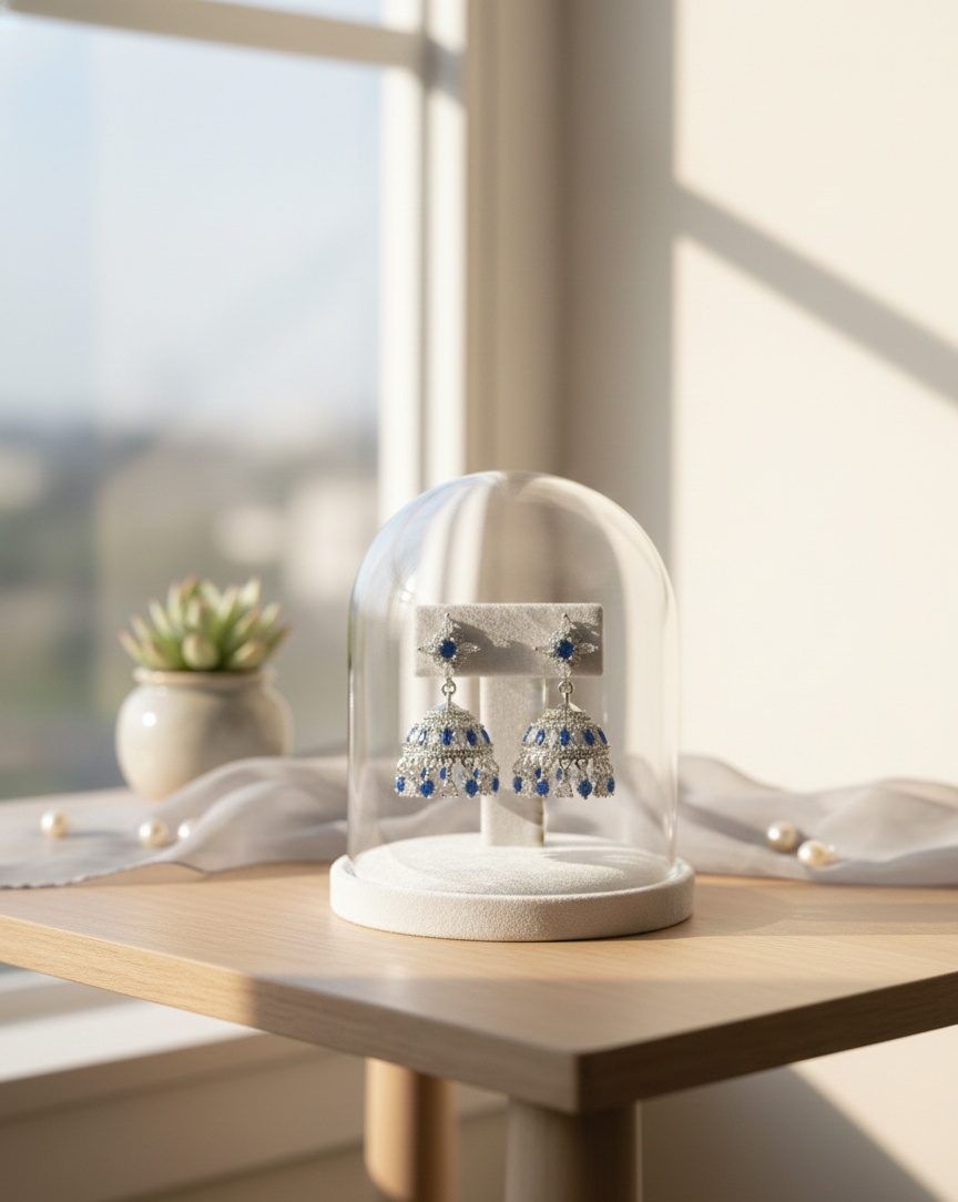 - Sapphire Blue Accents: Features rich blue stones in the stud and scattered across the jhumka dome, providing a vibrant contrast to the silver base.