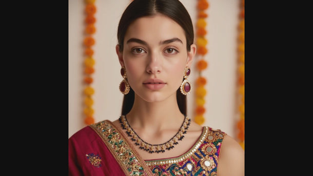 This traditional mangalsutra features intricately designed black beads interspersed with gold-tone and pearl cluster charms. Worn by married Hindu women, its black beads symbolize protection and prosperity, while the blend of faux pearls and golden charms delivers a striking festive look suited for daily or special occasion use. Lightweight and vibrant, this mangalsutra complements both traditional and modern ethnic outfits, making it an ideal gift for wives, mothers, or brides. Avoid contact with water, perfume, or sprays to preserve its shine.