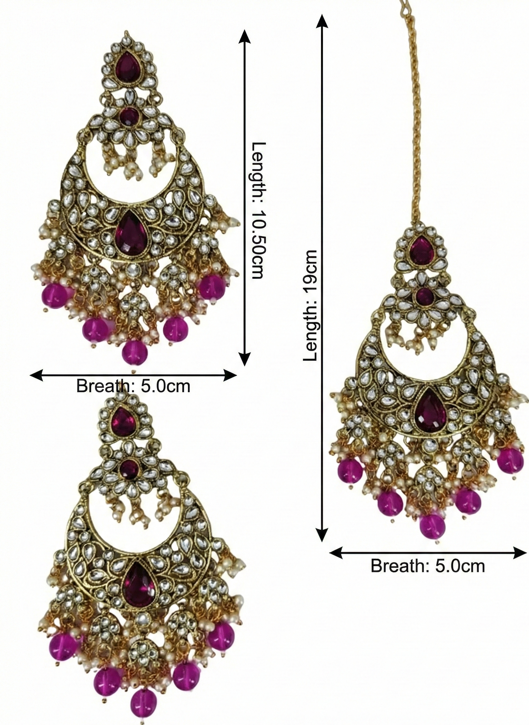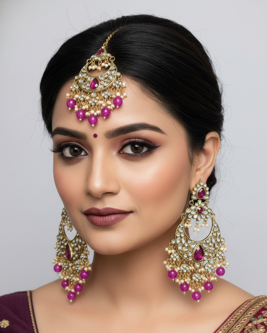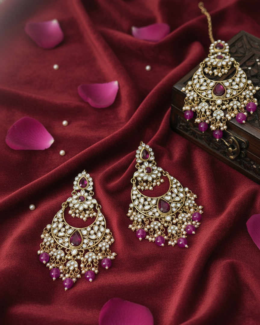 • Coordinated 3-Piece Set: Includes a pair of crescent-shaped chandbali earrings and a perfectly matching maang tikka for a complete traditional look.