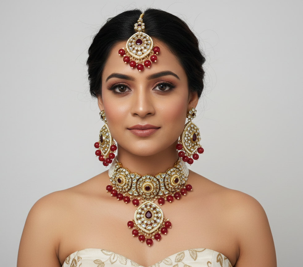 - Traditional Bridal Trio: A complete 3-piece set comprising a choker necklace, matching earrings, and a maang tikka, designed for a cohesive festive look.