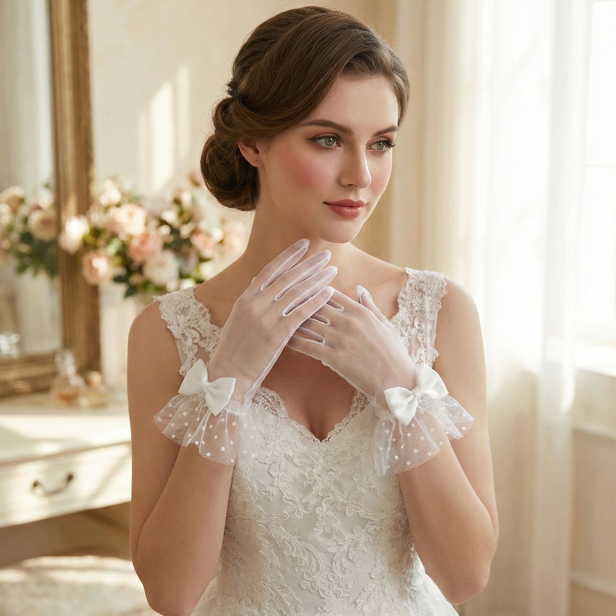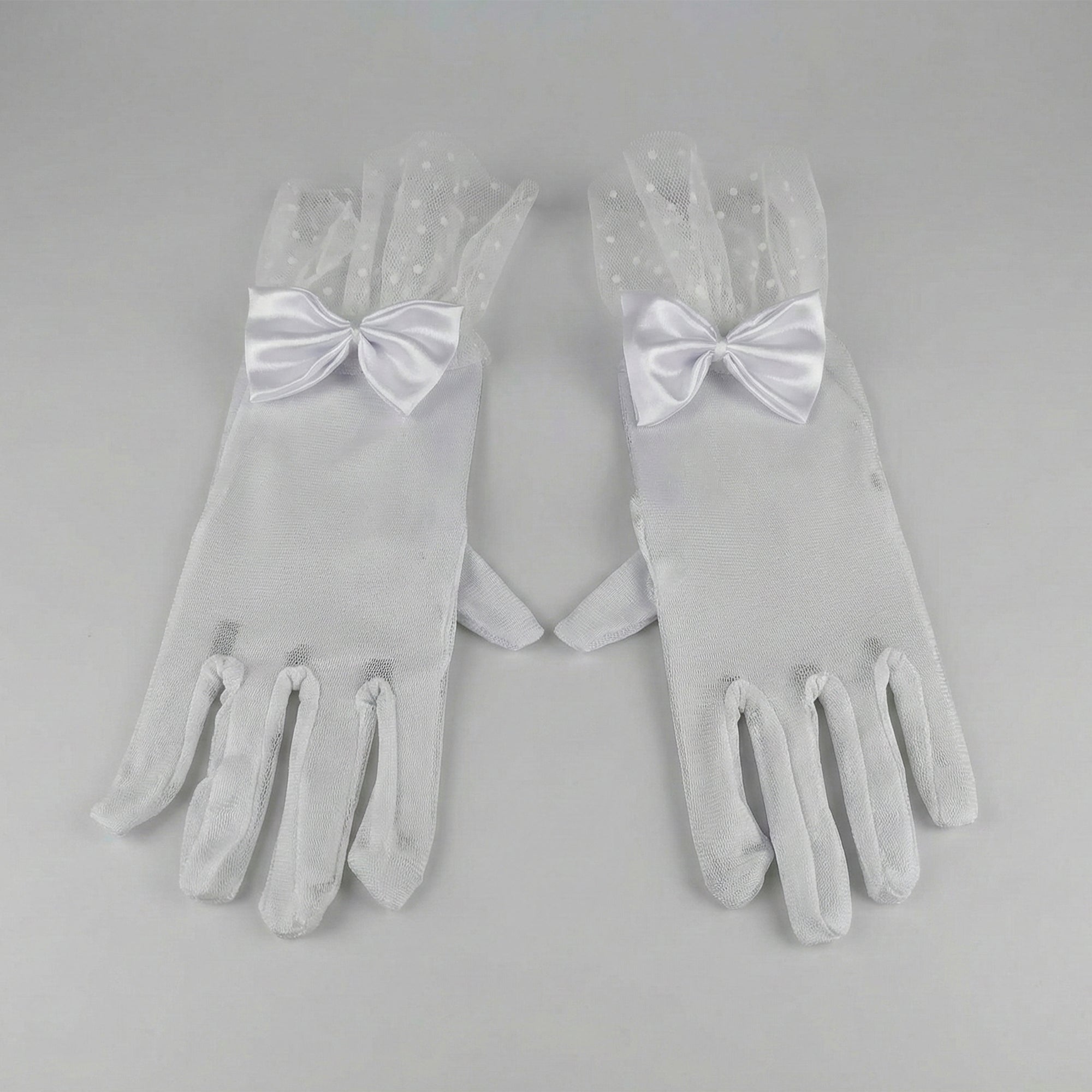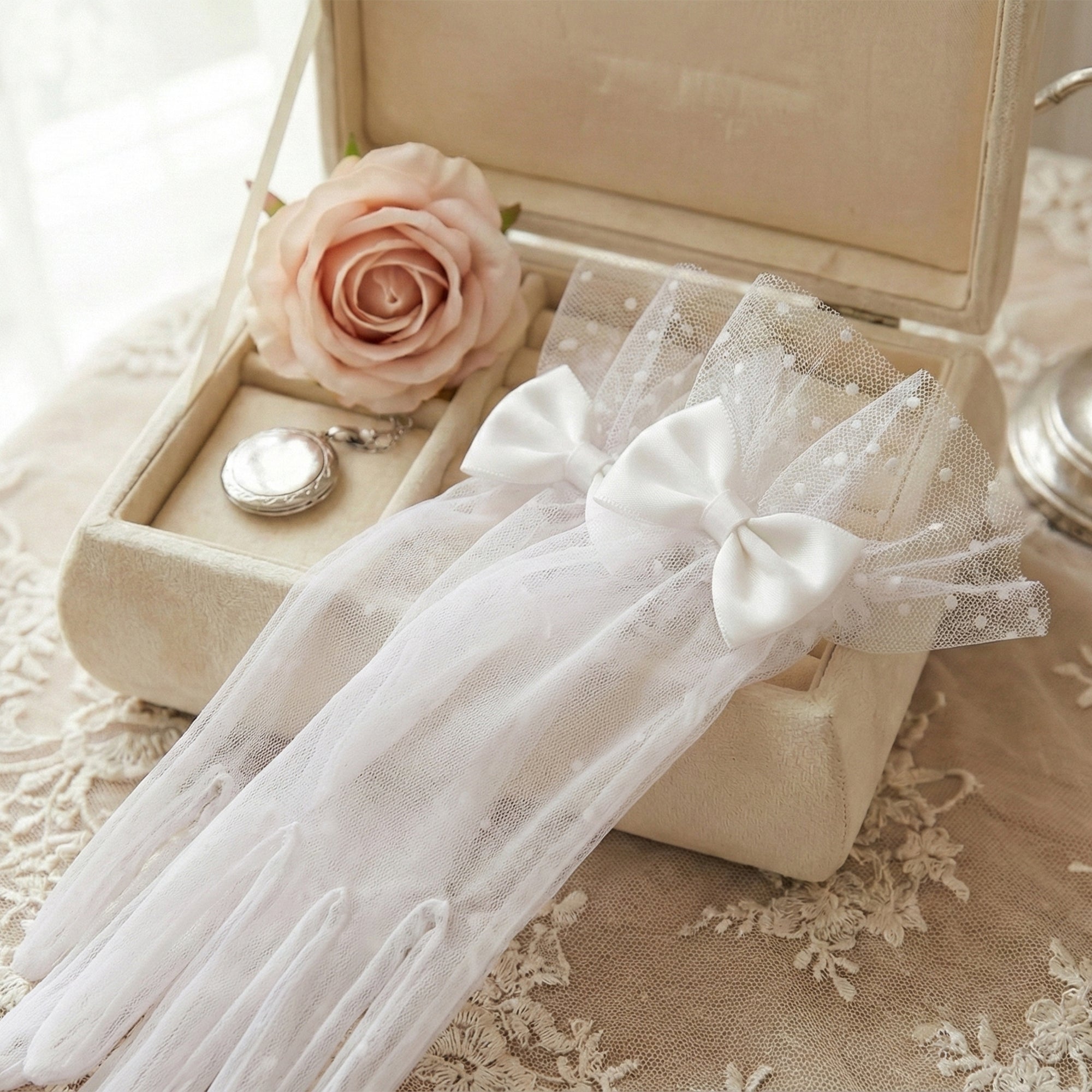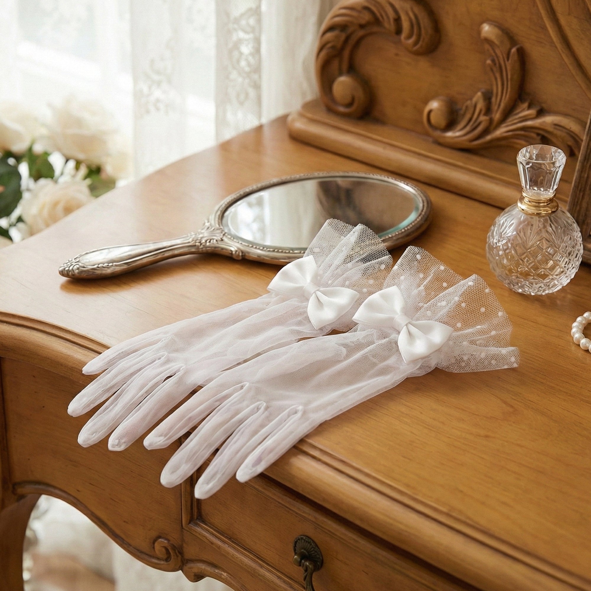 These elegant white lace gloves feature a delicate sheer mesh design with beautiful bow accents at the wrist, adding a touch of charm and sophistication. Designed for comfort and style, the stretchable material ensures a snug yet flexible fit for most hand sizes. Perfect for brides, bridesmaids, parties, vintage-themed outfits, and special occasions, these gloves enhance any formal or festive look. Lightweight and breathable, they are suitable for extended wear without discomfort.