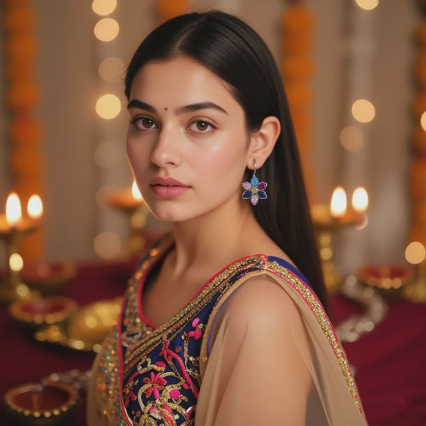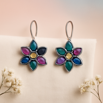 Item Name | OMID, Navratna Floral Stone Earrings for Women | Multi-Gemstone Traditional Indian Dangle Hook Earrings | Festival & Daily Wear Jewellery |