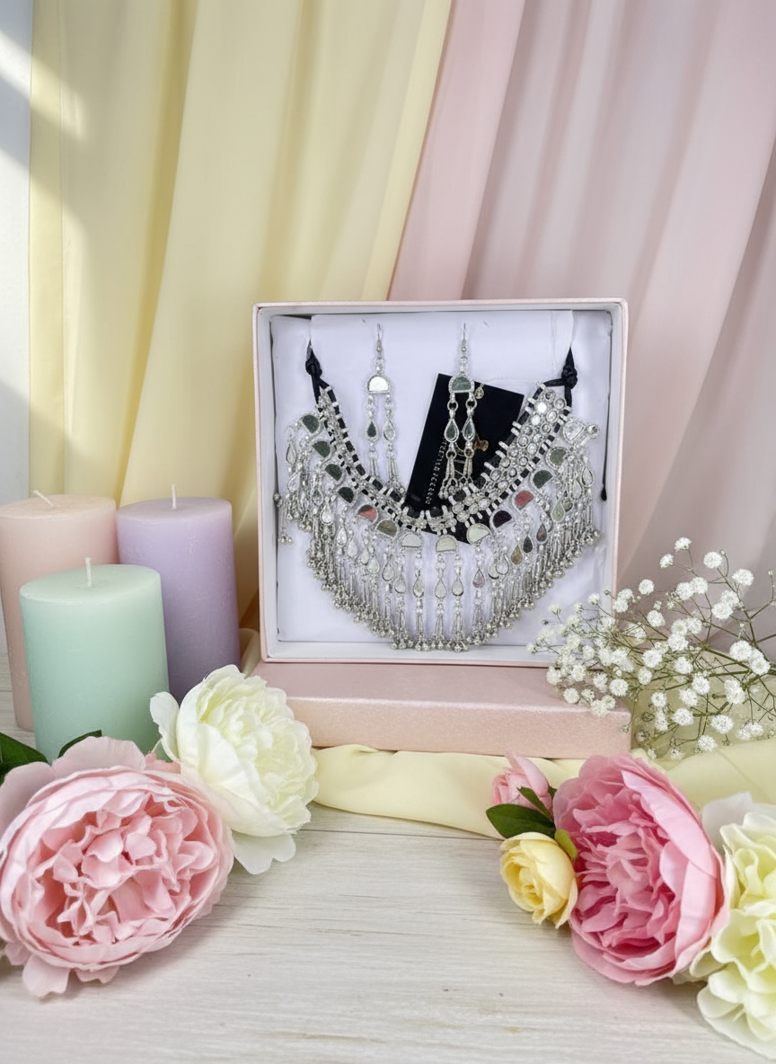 Upgrade your accessory collection with this stunning oxidised mirror work choker necklace set. The set includes a classy choker necklace intricately embellished with shining glass mirrors and oxidised silver plating, paired with matching statement dangle earrings. Handcrafted by skilled artisans, the necklace features an easy-to-adjust thread closure at the back, ensuring flexibility and comfort for all wearers.