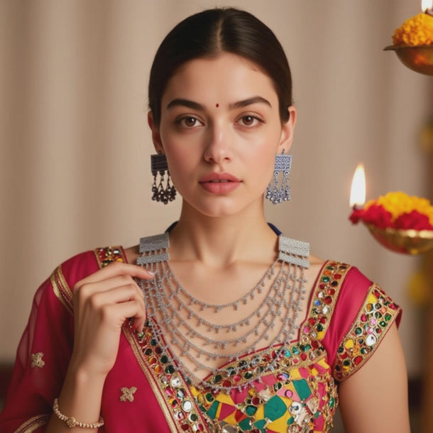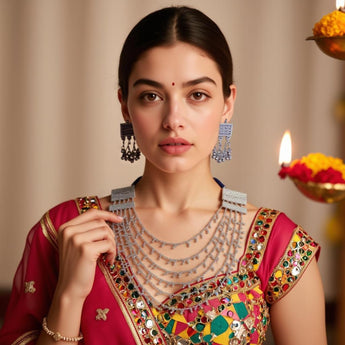 - Traditional oxidised silver-plated layered necklace set, perfect for festive and special occasions.
