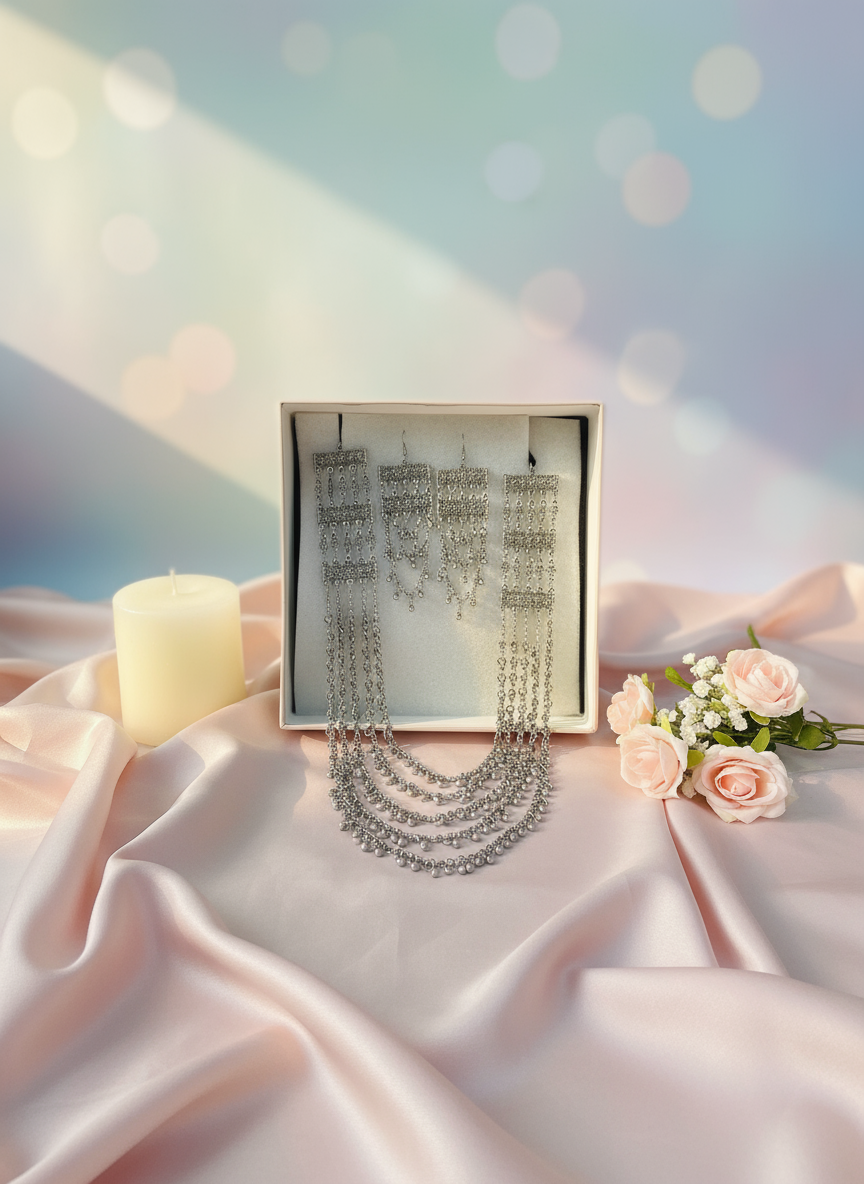 Elevate your ethnic look with this stunning oxidised silver-plated layered necklace set featuring multiple cascading chains and intricate bead detailing, paired with coordinated long earrings. Designed to add elegance to any outfit, this traditional jewelry set is perfect for weddings, festivals, or any festive celebration. The adjustable tie closure ensures a custom fit, while the lightweight material makes it comfortable for daily wear. Its antique silver finish and statement design make it an eye-catching addition to your accessory collection. Maintain the shine by storing in a cool, dry place and avoiding direct contact with water or chemicals.