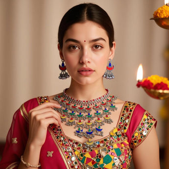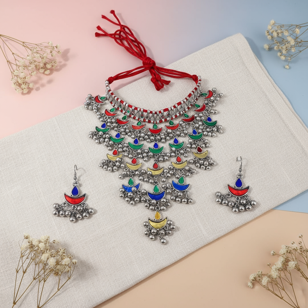 Item Name | OMID, Oxidized Multicolor Diya Choker Necklace Set for Women – Traditional Ethnic Jewelry with Jhumki Earrings |