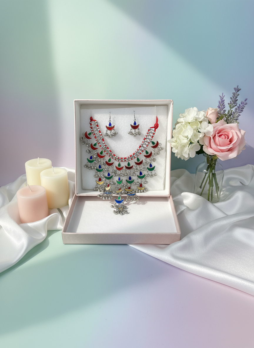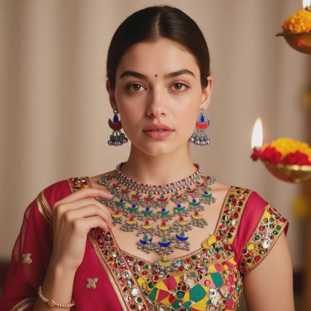 This beautiful oxidized choker necklace set features a striking diya (oil lamp) motif hand-enameled in vivid colors, ideal for festive or ethnic occasions. Each diya piece is meticulously crafted and finished with traditional metal beads and dangling ghungroos for a statement look. The necklace comes with an adjustable dori tie, ensuring comfort and a custom fit. The matching earrings are lightweight and easy to wear, making the set perfect for celebrations, parties, or gifting.