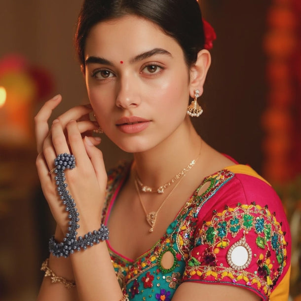 This unique oxidized silver beaded bracelet and ring combo features dense clusters of metallic beads, expertly handcrafted for a bold yet elegant statement. The intricate beadwork is paired with an antique oxidized finish, giving the set a vintage and rustic appeal. Adjustable chains ensure a comfortable fit for various wrist and finger sizes, making it perfect for both ethnic and modern outfits. Wear it solo for a minimalist chic look or stack with other silver accessories for a trendy, layered appearance. Ideal for festive occasions, parties, daily styling, or as a thoughtful gift for loved ones.