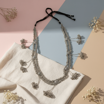 This elegant and ornate kamarbandh features a dual-strand chain adorned with intricate filigree motifs and multiple clusters of dangling bell charms, reflecting traditional Indian craftsmanship. Crafted from durable alloy with high-quality silver plating, this waist chain is hypoallergenic and tarnish-resistant, ideal for sensitive skin. The adjustable black thread ensures a comfortable and secure fit, making it suitable for various waist sizes. Perfect for pairing with sarees, lehengas, or fusion wear, this belly chain adds a regal touch to festive and bridal attire, turning heads at weddings, celebrations, and cultural events.