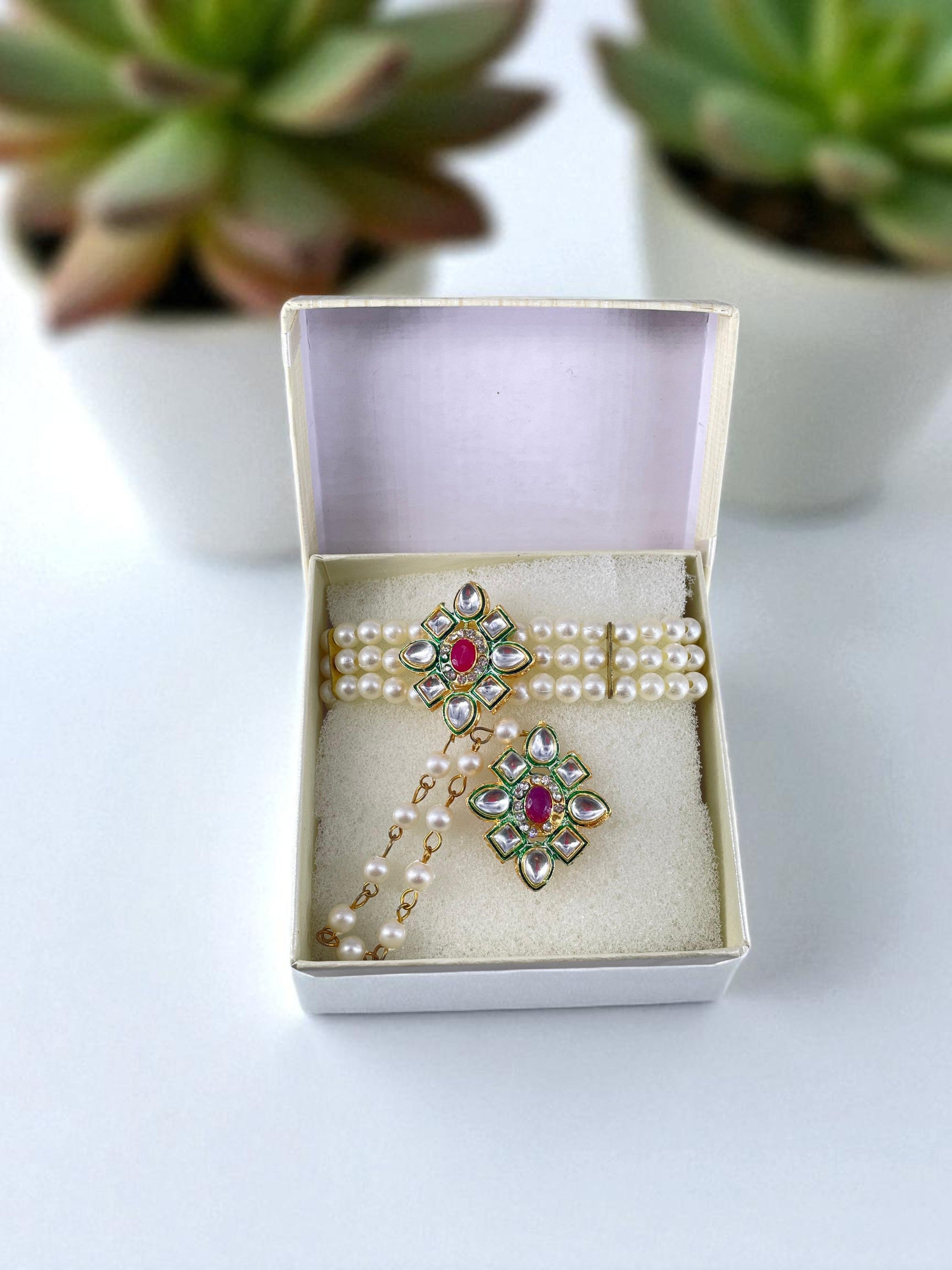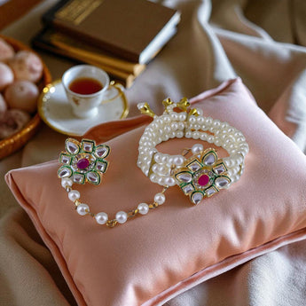 This exquisite haath phool features multi-strand synthetic pearls with gold-plated stonework and sparkling Kundan accents. The floral design centers a bold red stone, making it a statement accessory for bridal, festive, or party ensembles. Handcrafted by skilled artisans, the jewelry is both lightweight and durable, ideal for long celebrations. An adjustable chain link ensures a comfortable fit for any wrist size. Pair this hand harness with sarees, lehengas, or Indo-Western outfits for a touch of timeless elegance and royal charm.