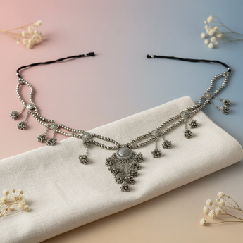 This beautifully crafted oxidised silver plated kamarband adds a touch of vintage elegance to ethnic ensembles. Featuring intricate floral coin motifs, double-layered chains, and dramatic tassel danglers, this waist chain belt is designed to accentuate sarees, lehengas, and festive wear. The adjustable thread tie ensures a comfortable and customizable fit for all waist sizes. Perfect for traditional events, Navratri, and special occasions, this kamarband offers a blend of classic charm and contemporary appeal.