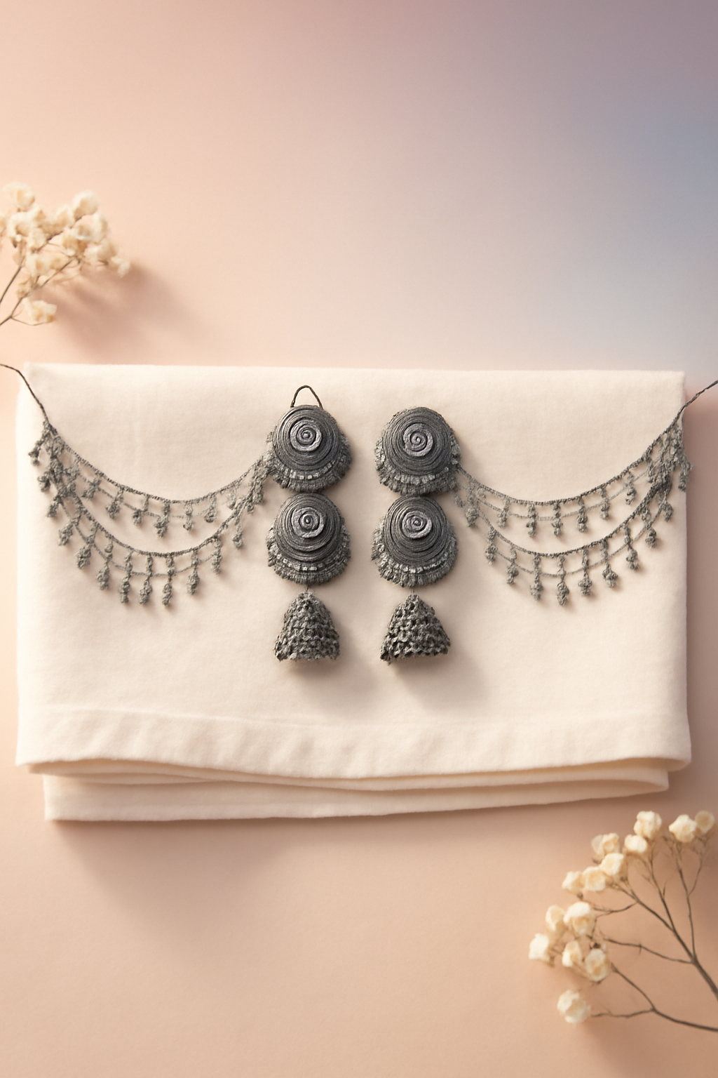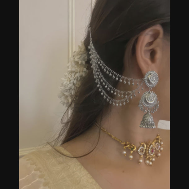 These traditional oxidized silver jhumka ear chain earrings are a classic blend of ethnic elegance and modern craftsmanship, designed to enhance bridal and festive looks. Each earring features a multi-layered chain that gracefully drapes along the ears, adorned with intricate motifs and jhumka danglers for a statement effect. Ideal for weddings, festivals, or special occasions, the ear chains provide both style and support, reducing the strain of heavy earrings while creating a regal silhouette. Crafted from premium alloy with a lasting oxidized silver finish, these earrings are hypoallergenic and comfortable for extended wear. Pair them with sarees, lehengas, or anarkalis for a complete ethnic ensemble.