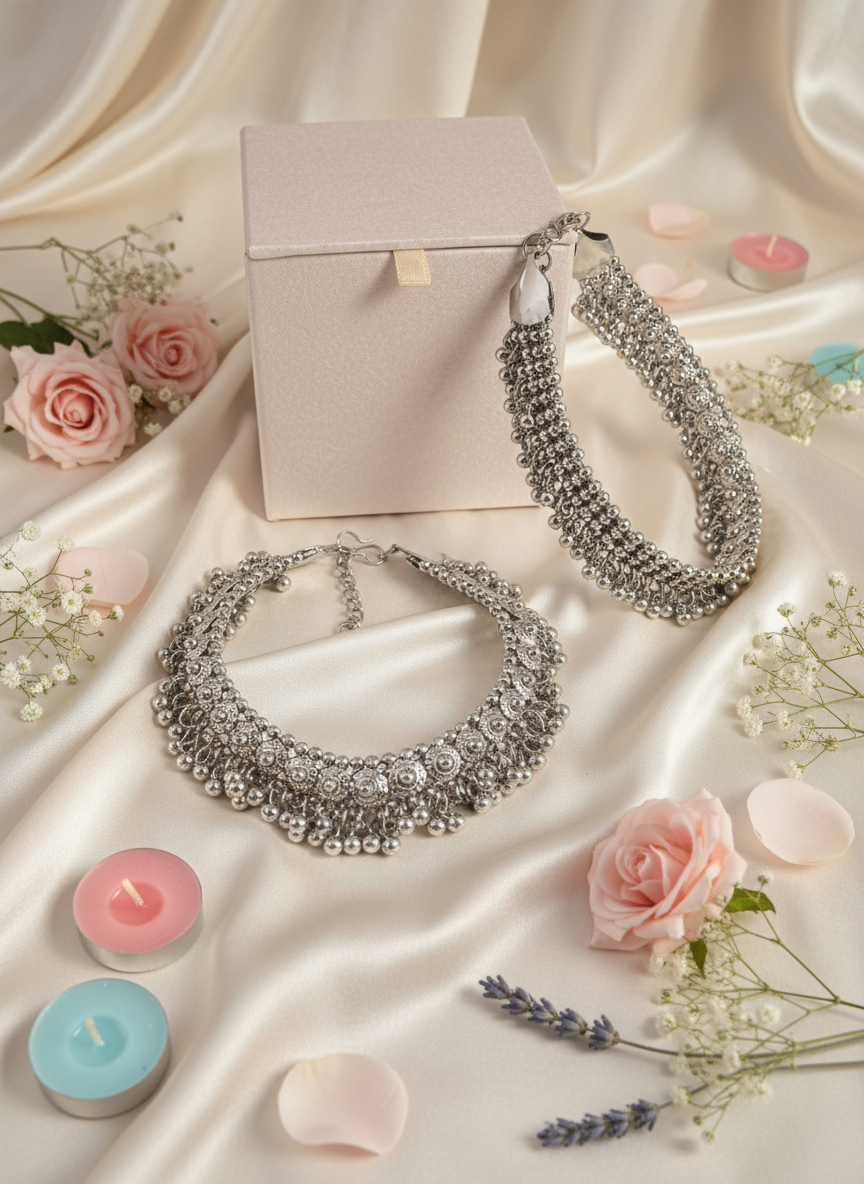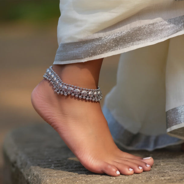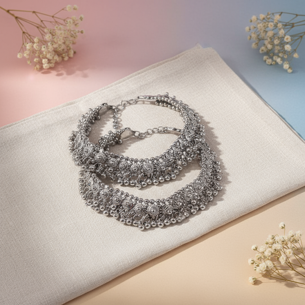 These oxidized silver-plated anklets are a perfect blend of traditional craftsmanship and contemporary elegance. Each anklet features detailed filigree work, classic motif arrangements, and delicate beadwork, offering a vintage and statement look for your ankles. The oxidized finish provides a timeless antique appeal that suits Indian and fusion outfits alike. Equipped with an adjustable clasp for comfort, these anklets are made for regular wear or special occasions. The artisan-quality ensures lasting shine and durability, making them a perfect gift for weddings, anniversaries, or festive celebrations.