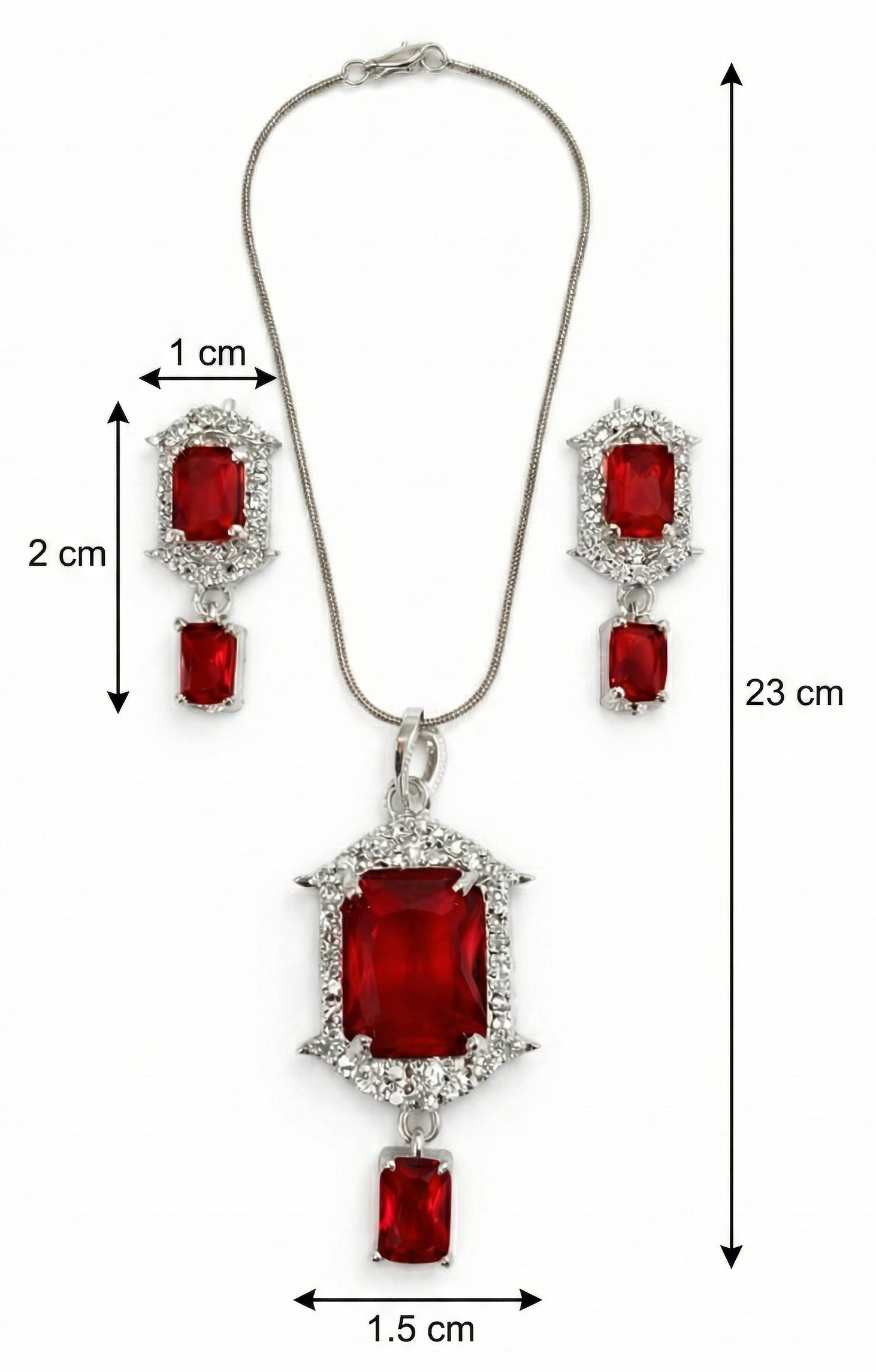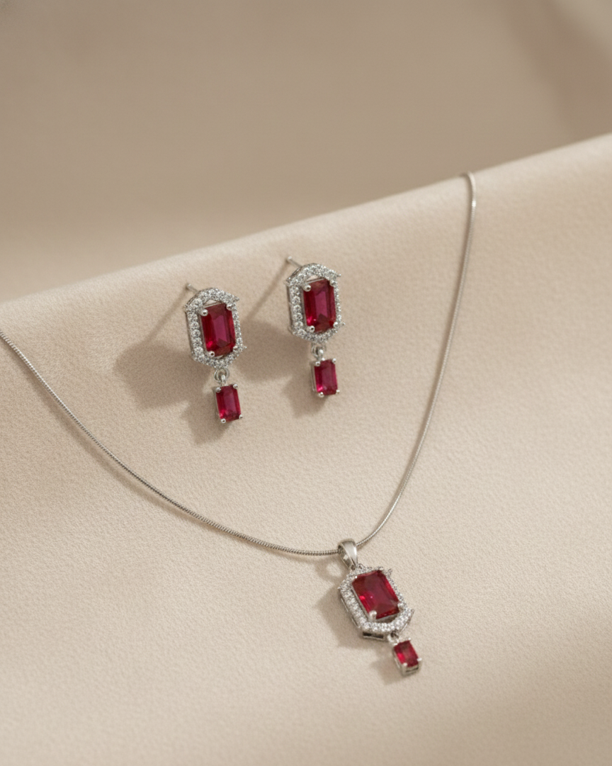 - Ruby Red Geometric Center: The pendant and earrings are centered around a deep red, rectangular (emerald-cut) stone that offers a bold and sophisticated look.
