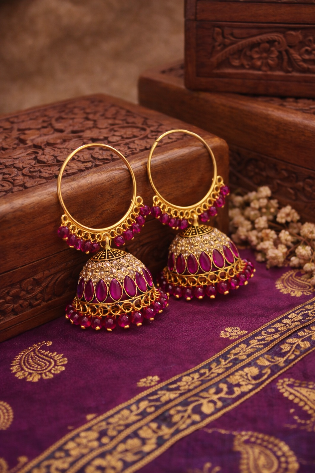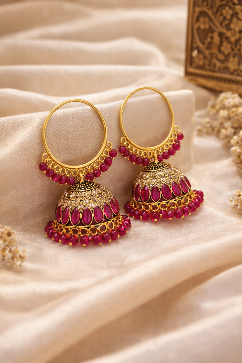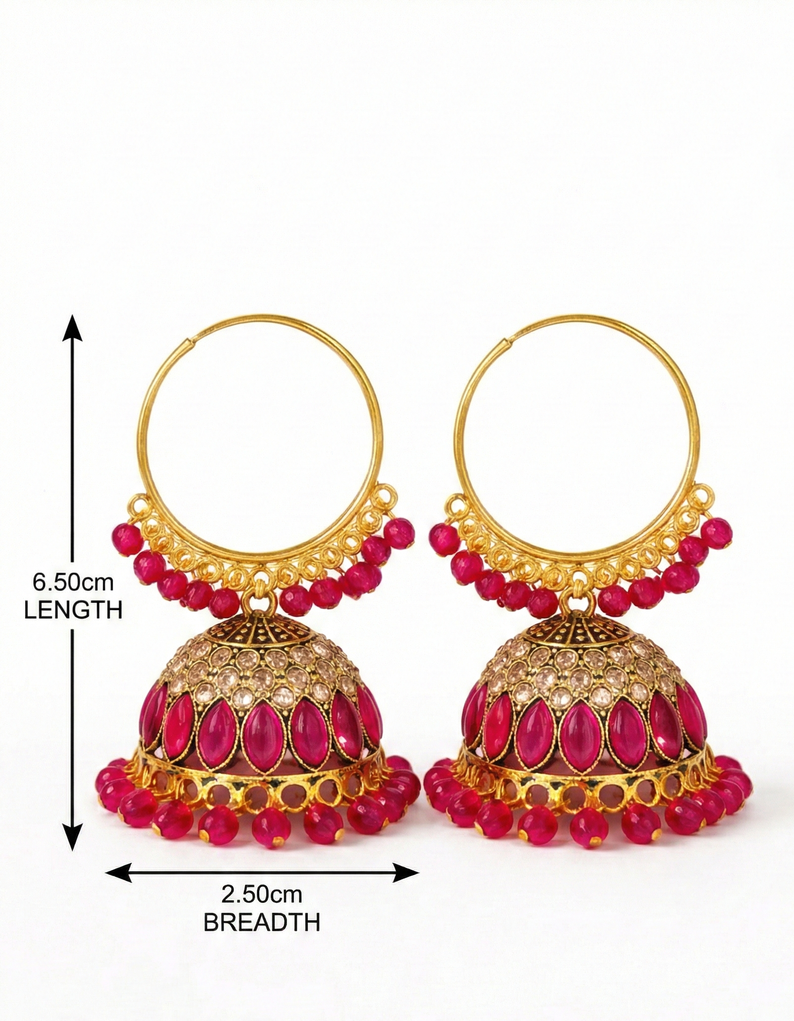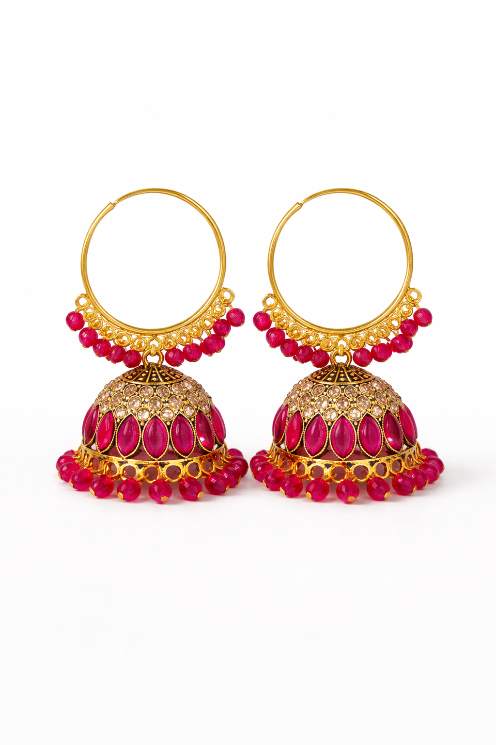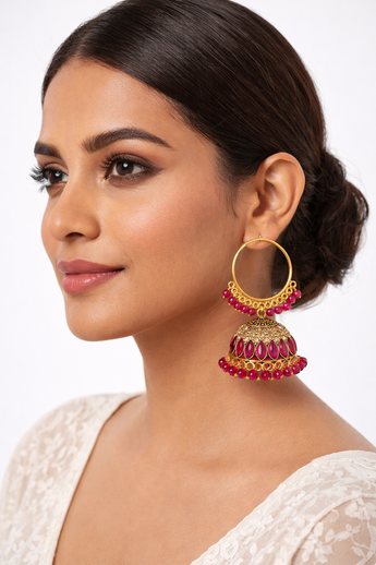 - Vibrant Beadwork: The bottom of the hoop and the jhumka dome are both edged with dangling ruby-pink beads, adding movement and color.