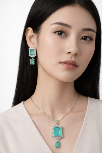 | Item Name | Luxury Emerald Green & American Diamond Geometric Pendant Necklace Set |