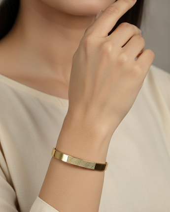 • Polished Highlights: The textured pattern is elegantly interrupted by smooth, mirror-polished gold segments, adding a modern geometric contrast.