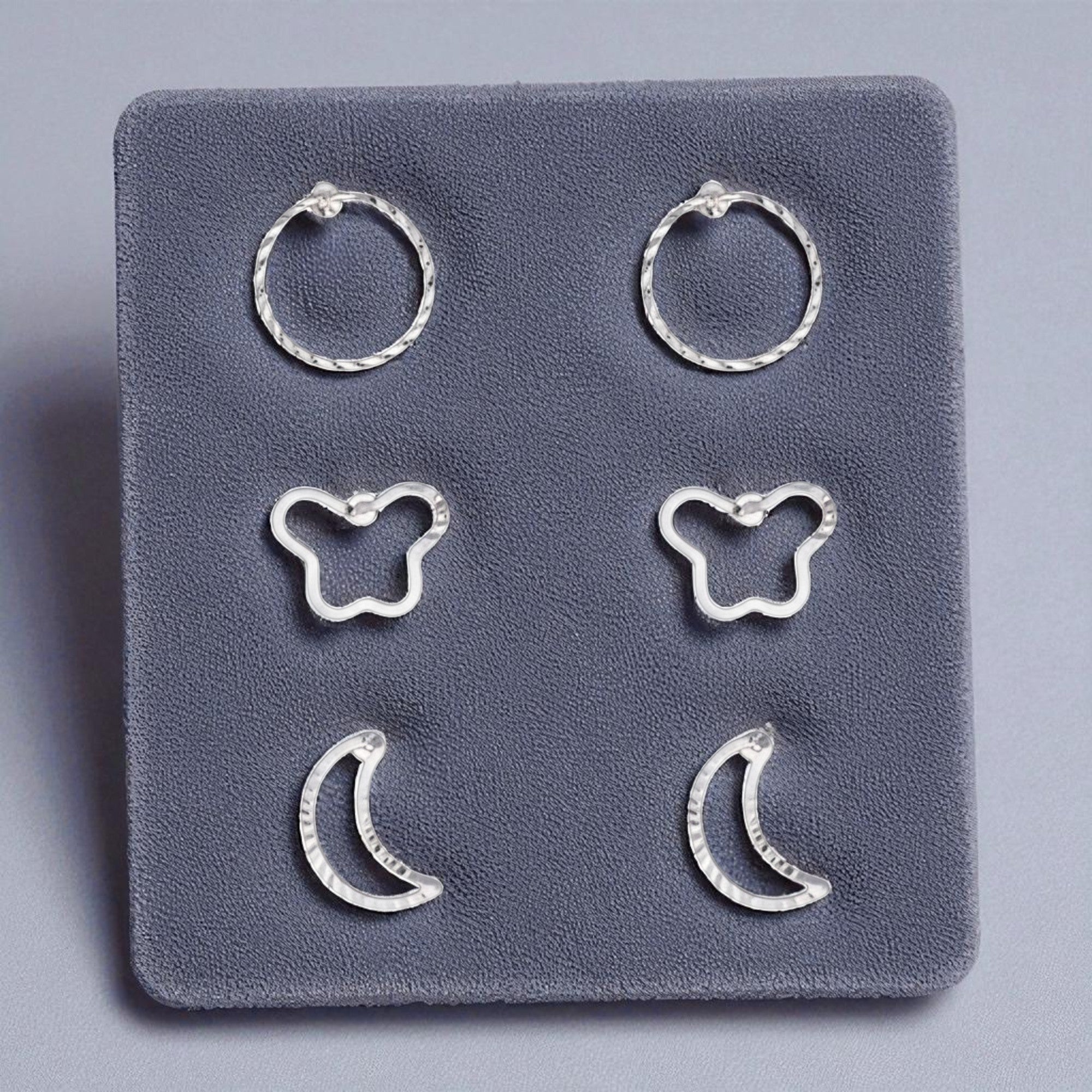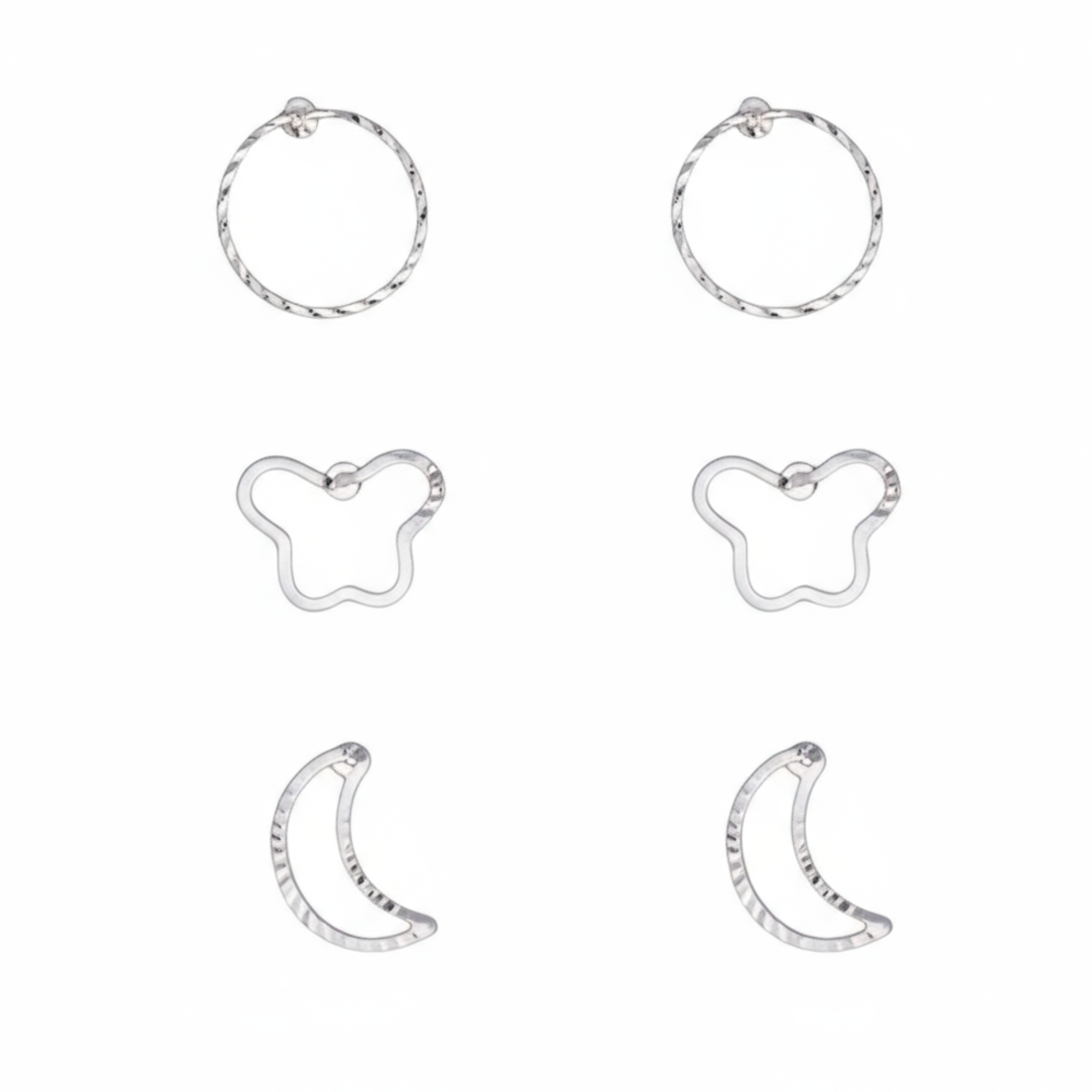 Upgrade jewelry options with this versatile sterling silver mini hoop earring set. Every pair features a unique open shape – classic circle, dainty butterfly, and sleek crescent moon – crafted from highly polished, textured silver. Each piece is lightweight, hypoallergenic, and easy to wear, designed for mix-and-match styling or minimalist stackable looks. Great for everyday wear or to dress up any casual or formal outfit, these timeless designs make thoughtful presents for loved ones.