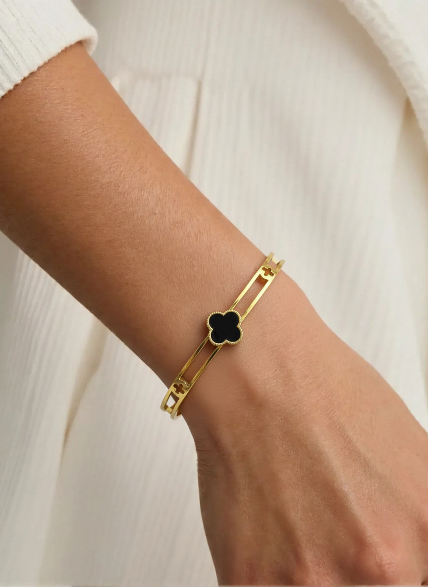 This bracelet features a slim gold-toned bangle highlighted by a single black clover charm, creating a chic balance of modern minimalism and classic elegance. The four-leaf style clover motif is widely associated with good luck and positivity, making this piece both stylish and meaningful.