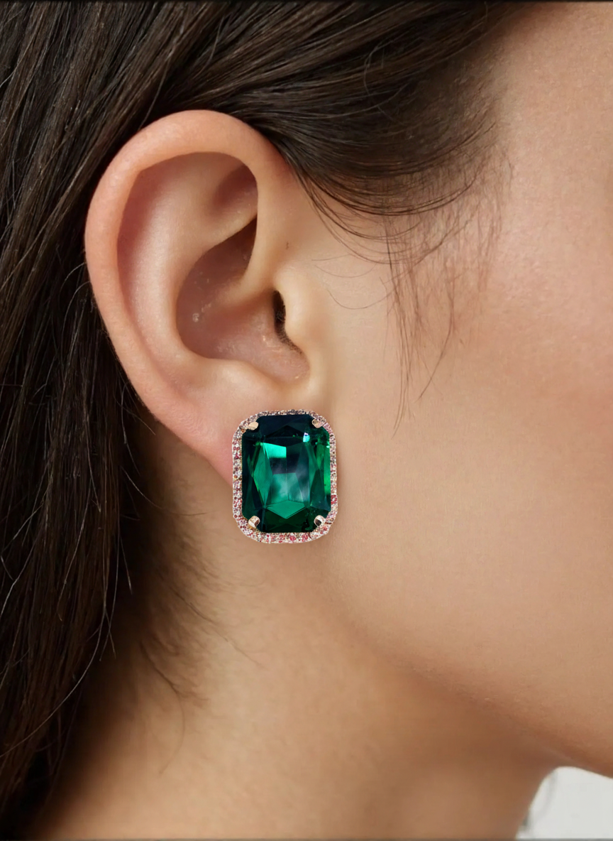- Eye-catching emerald green rectangular crystals create a bold, luxurious look for any outfit.