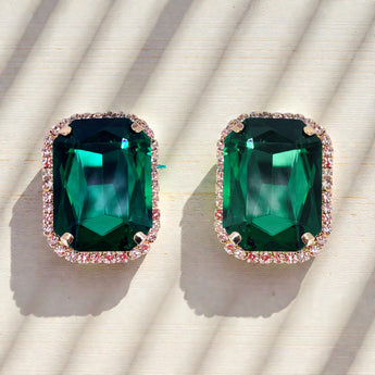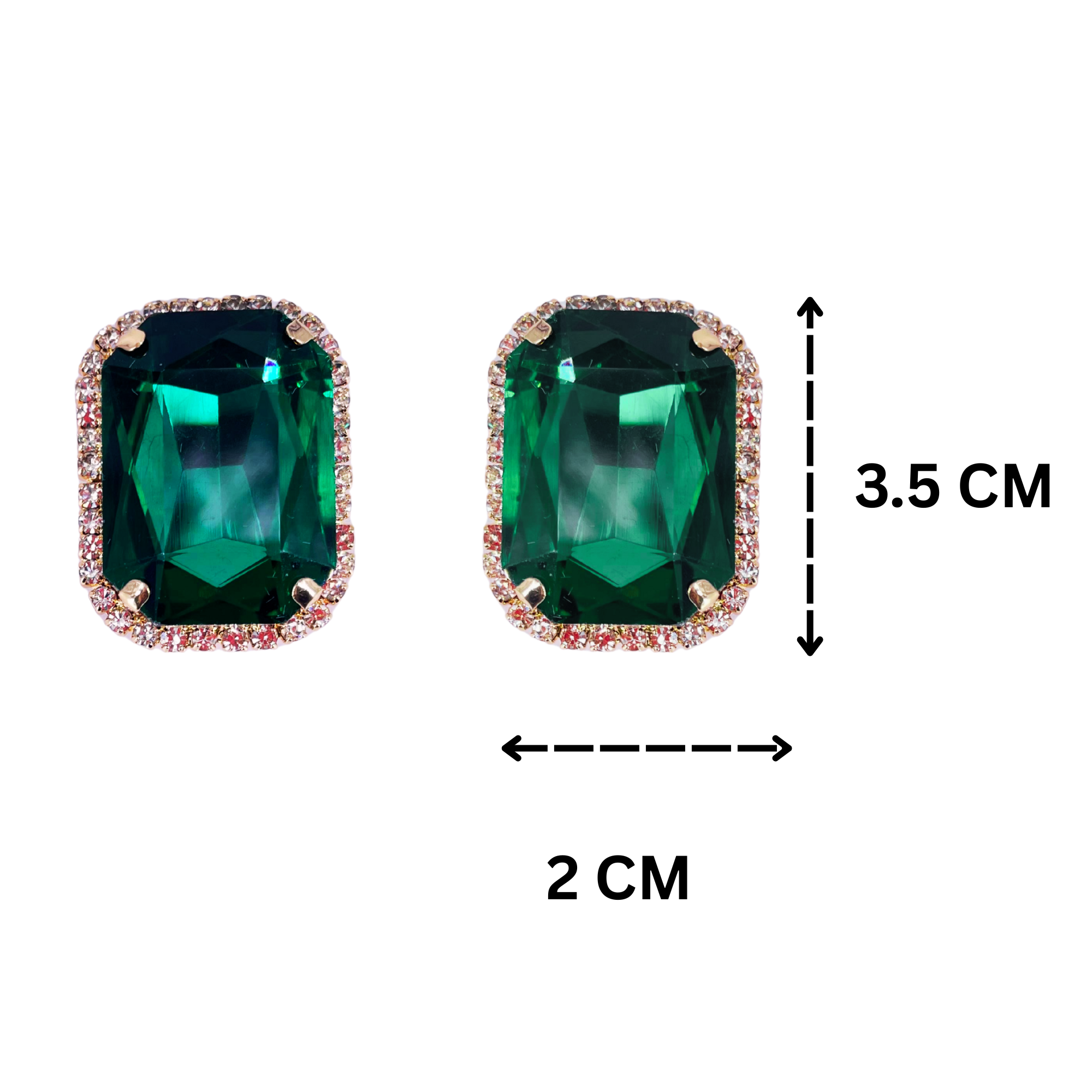 These emerald green crystal statement studs feature large rectangular stones framed by a ring of clear rhinestones in a gold-tone setting, giving a sophisticated and glamorous finish. Designed to stand out, they pair beautifully with dresses, sarees, gowns, and formal evening looks for special events.