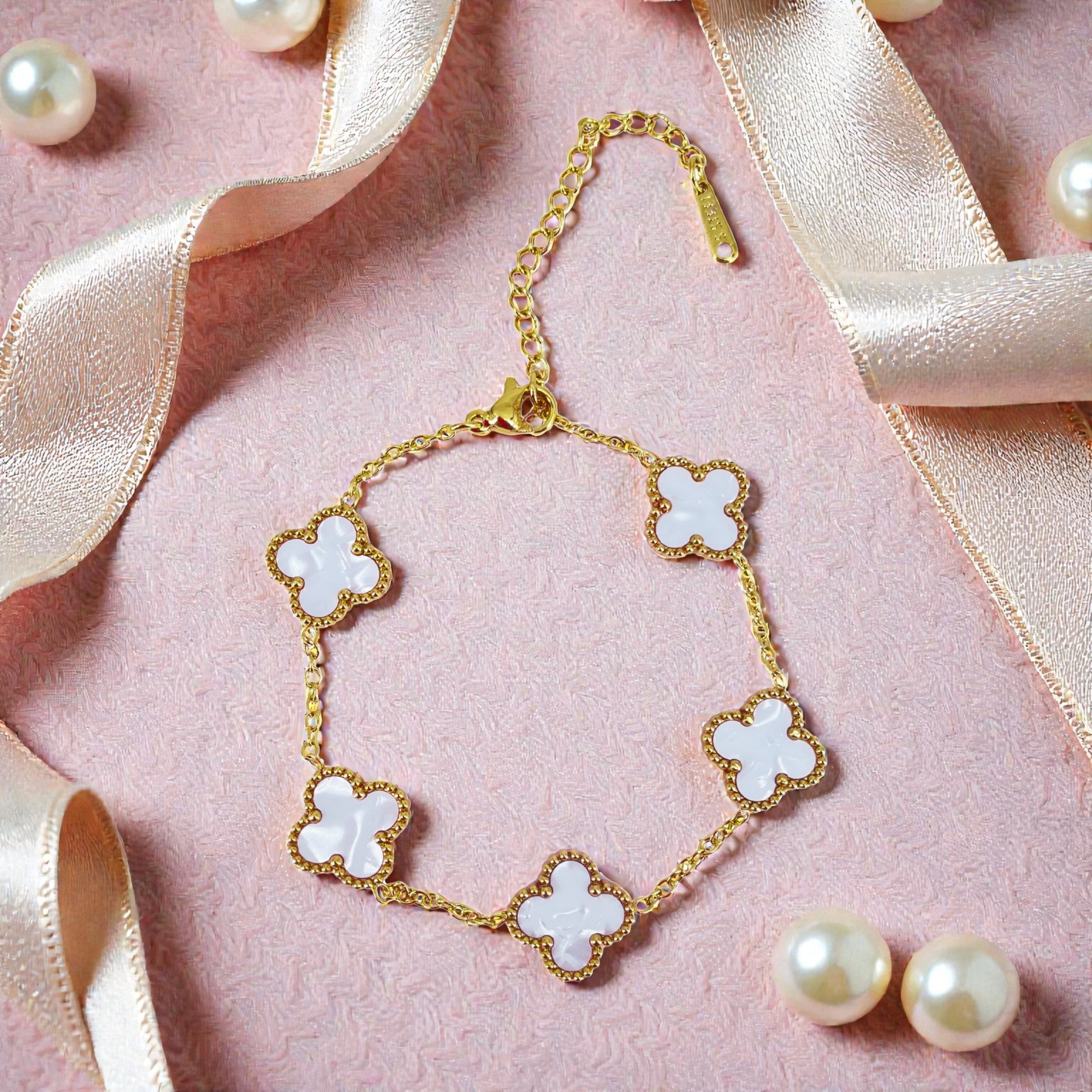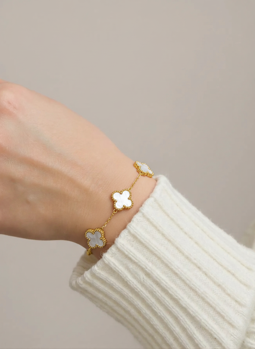 Elegant Five Clover White Enamel Gold-Tone Bracelet for Women and Girl