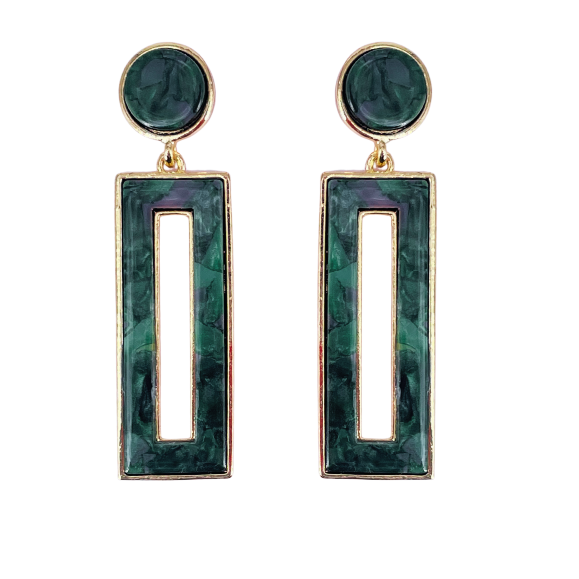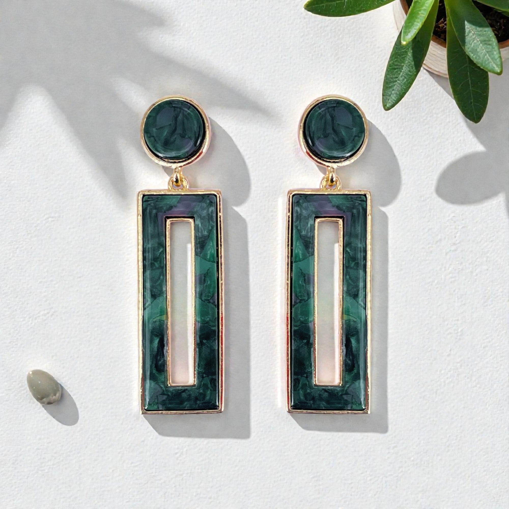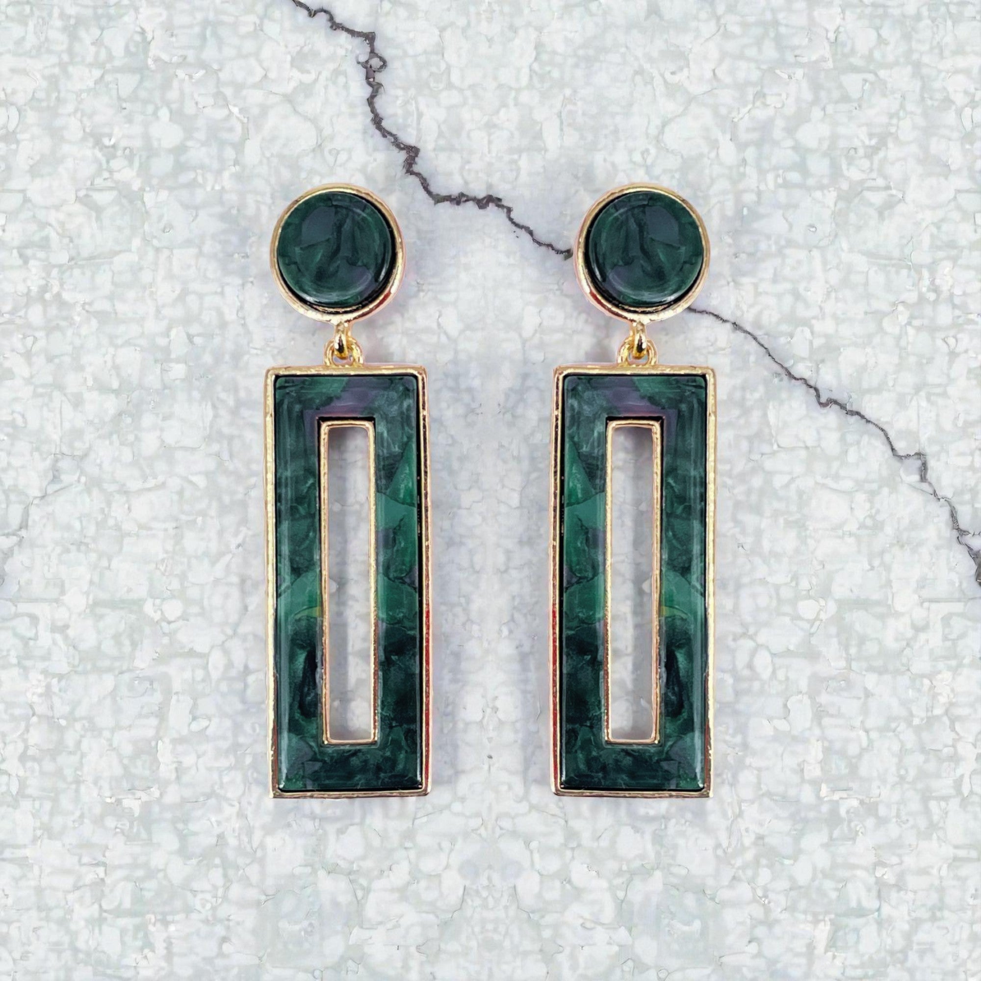 These earrings showcase a sleek combination of emerald‑green panels and gold‑tone metal, giving a clean, architectural feel that instantly elevates any outfit. The elongated rectangular drop with a center cut‑out adds dimension and movement while keeping the design minimal and sophisticated.