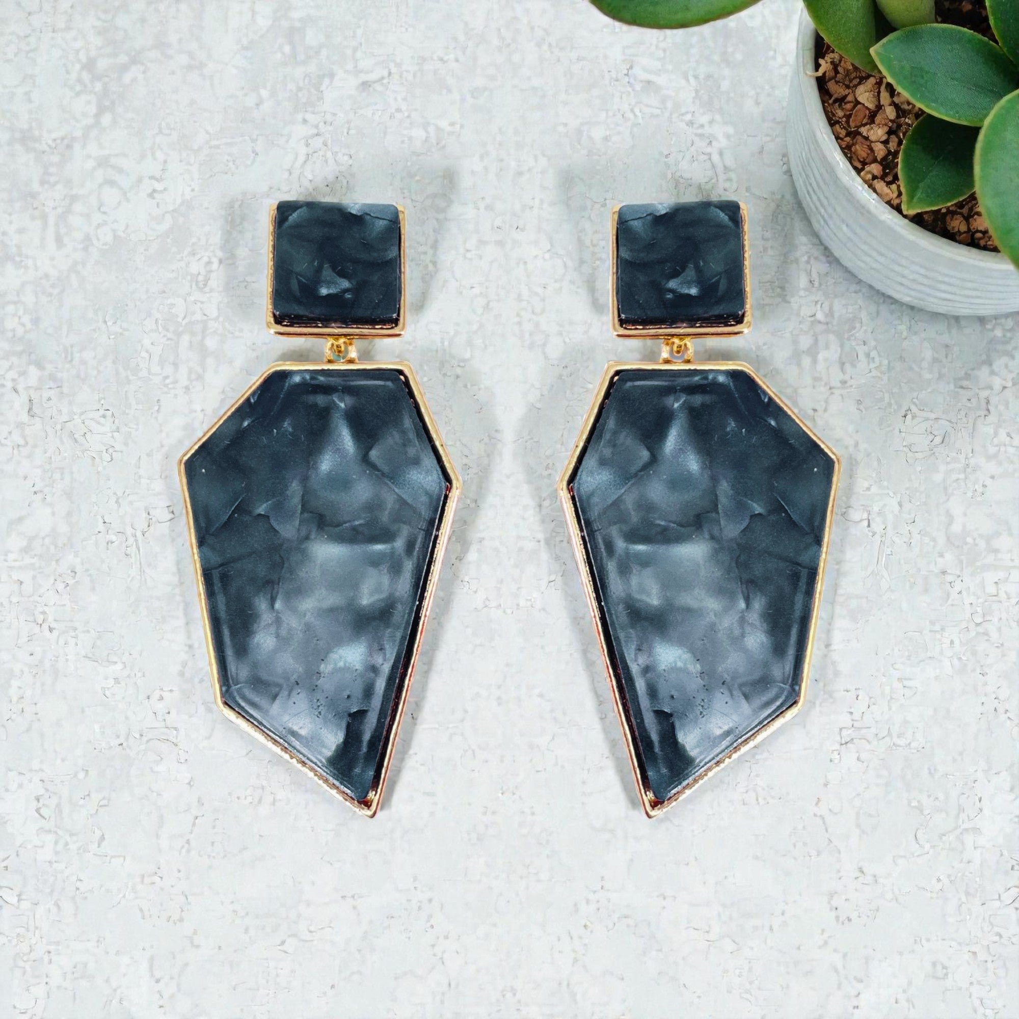 These geometric marbled resin statement earrings instantly elevate any outfit with their bold shape and sophisticated black-grey marble effect. The gold-tone outline adds a refined touch, making them perfect for styling with both minimal looks and glamorous evening wear.