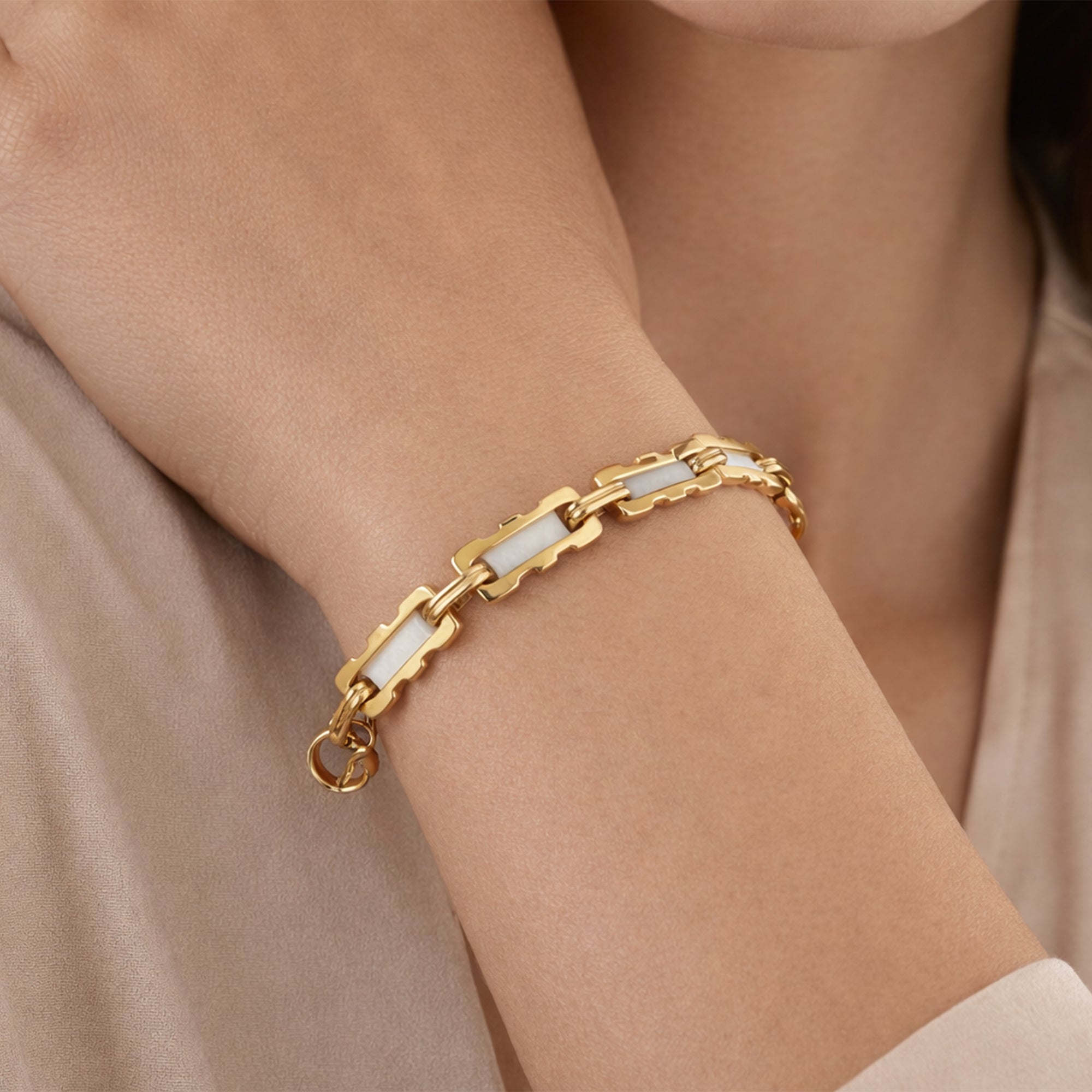 Crafted with structured rectangular links for a modern, sculptural look and polished gold shine. It's versatile for stacking or solo wear, balancing strength with comfort on the wrist. Handmade elements ensure timeless appeal suitable for any occasion.