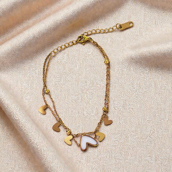 This fashionable charm bracelet features a romantic double-chain design adorned with cascading heart motifs in warm gold tones. The standout centerpiece showcases a luminous mother of pearl heart set within a polished gold-tone frame, creating an eye-catching focal point. The delicate satellite beads along the chains add texture and visual interest, while the dangling heart charms create beautiful movement with every gesture.