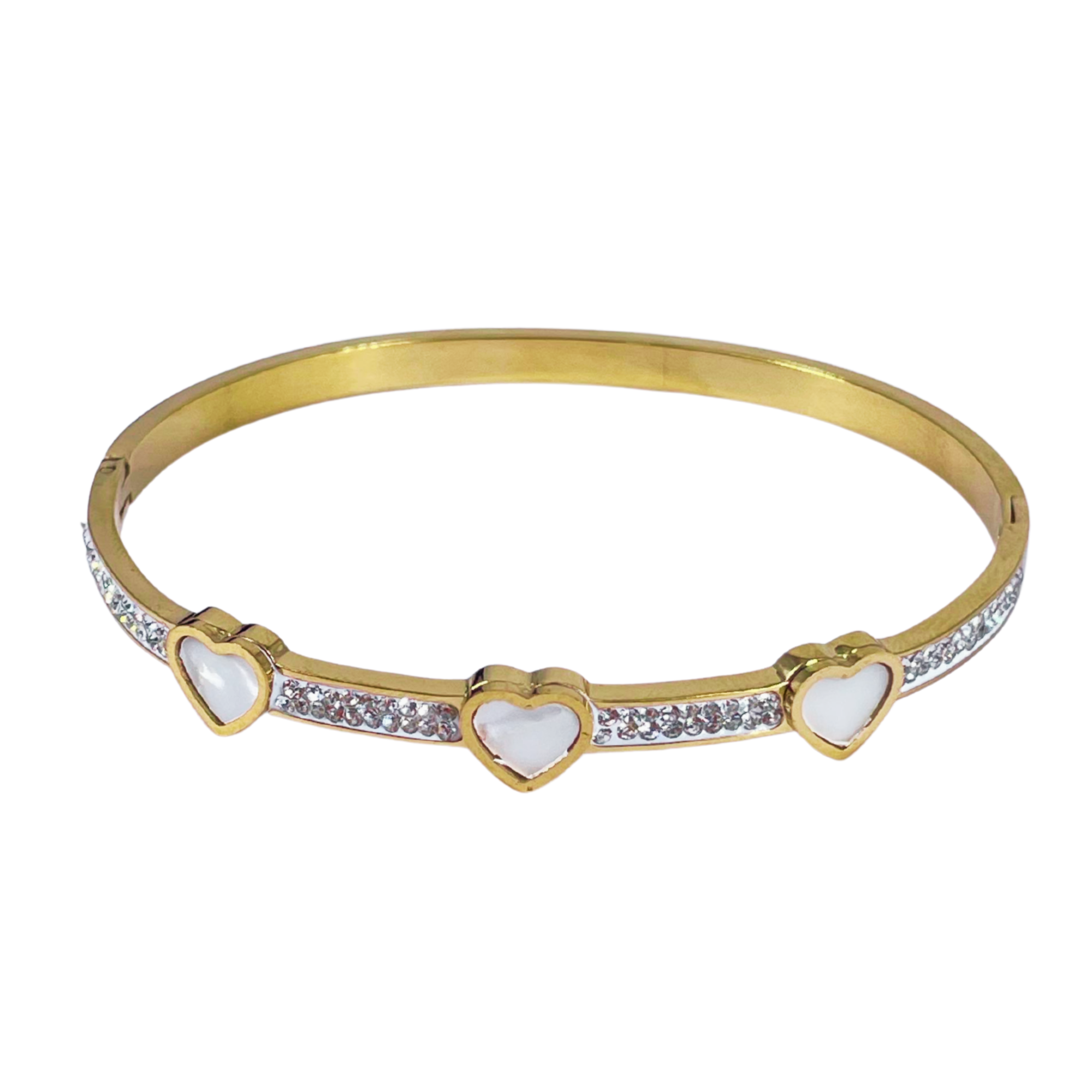 Item NameGold-Tone Mother of Pearl Heart Bangle Bracelet with Crystal Embellishments