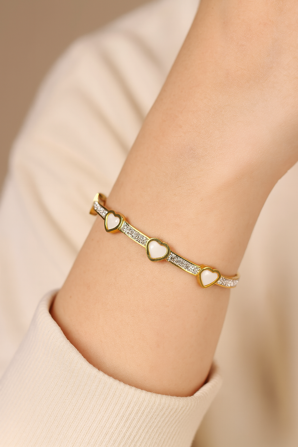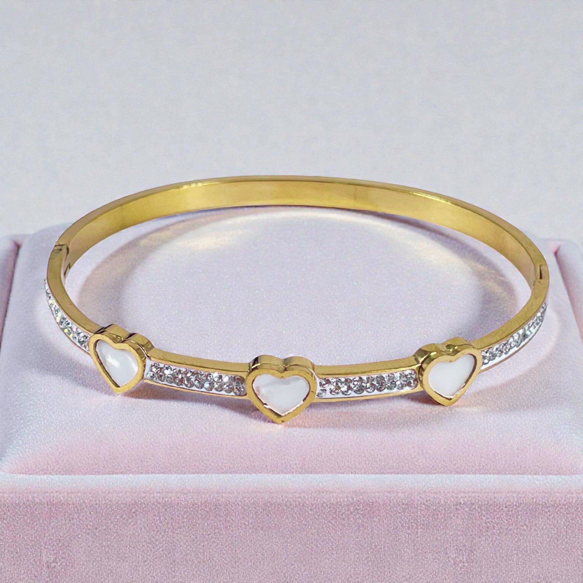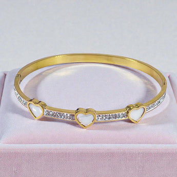 This stunning bangle bracelet combines timeless elegance with contemporary design, featuring three beautiful mother of pearl hearts surrounded by sparkling crystals. The gold-tone plated finish provides a luxurious look while remaining water, sweat, and heat-resistant. The simple yet classy design makes it an ideal accessory that adds sparkle to any outfit, from casual to formal.