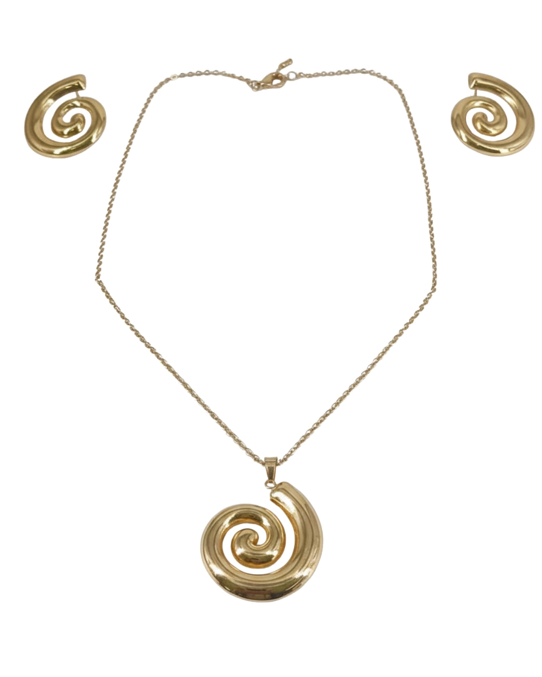 • Bold golden spiral motif pendant with matching earrings for a coordinated statement look.