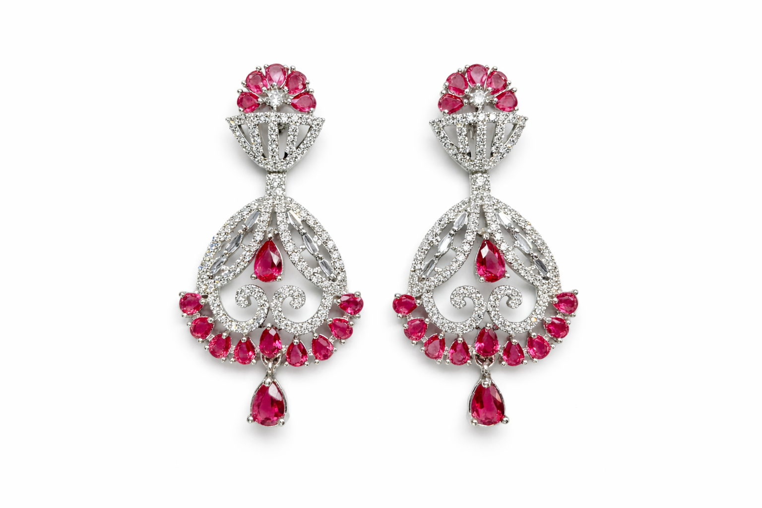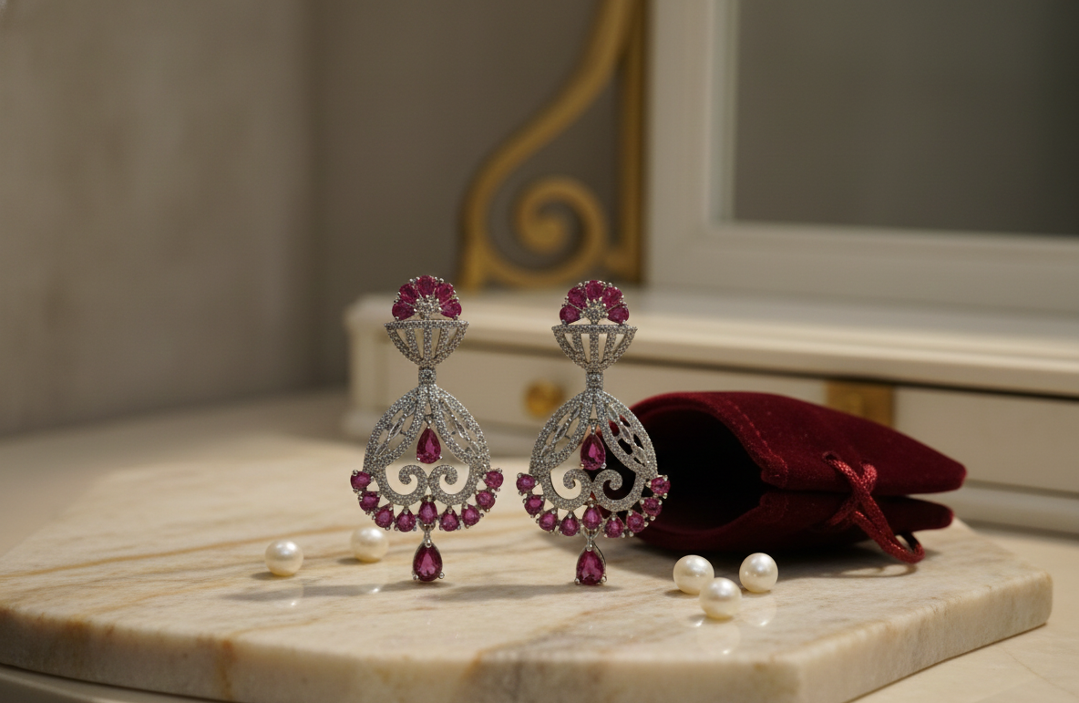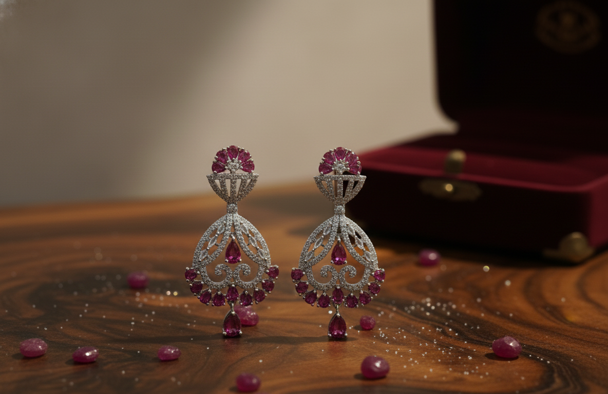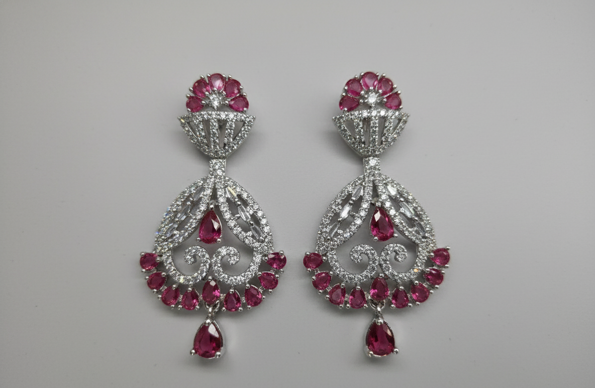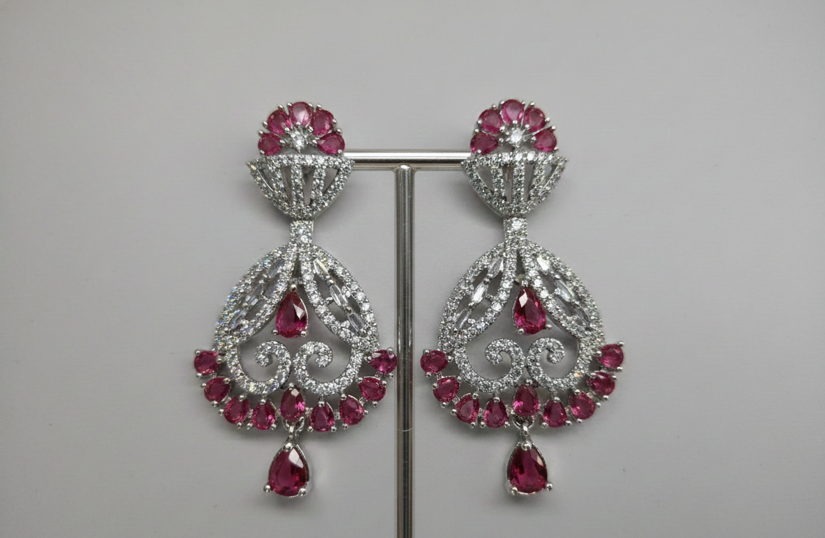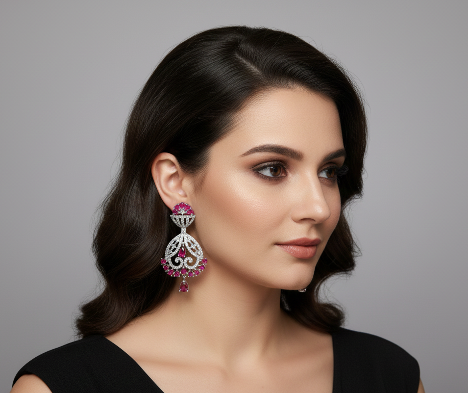 • Ruby Pink Accents: Vibrant pink stones are strategically placed at the stud, the center, the bottom rim, and the final drop to create a cohesive color story.