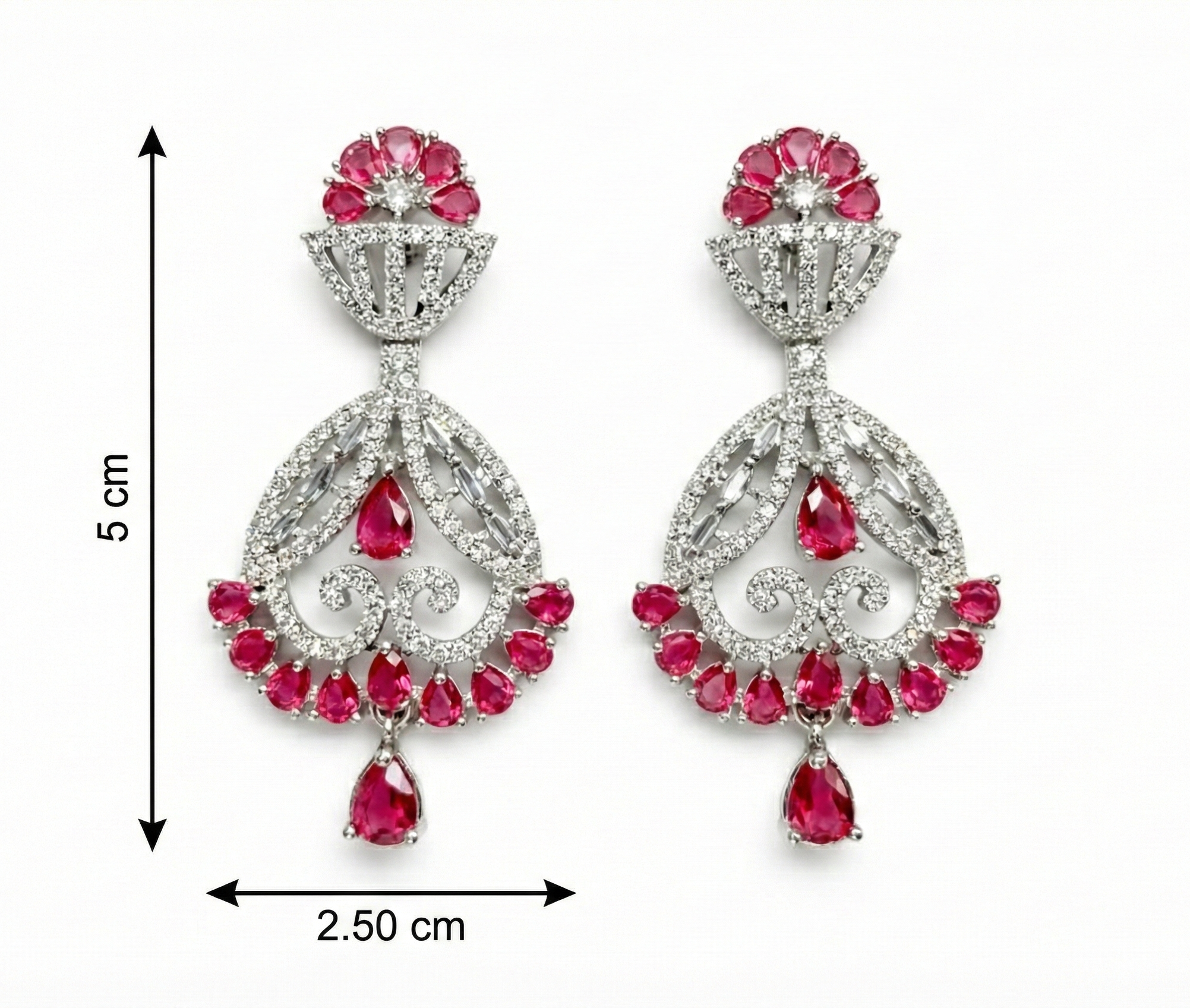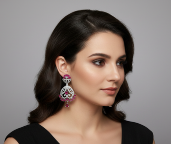 • Floral Stud Top: The earring starts with a delicate semi-circle or floral cluster of ruby-pink stones mixed with clear crystals.