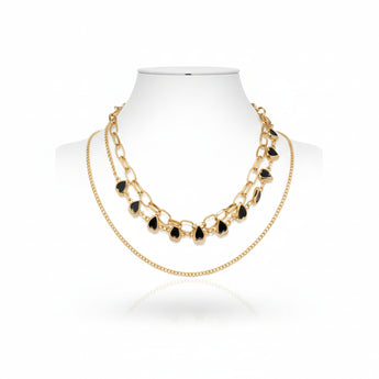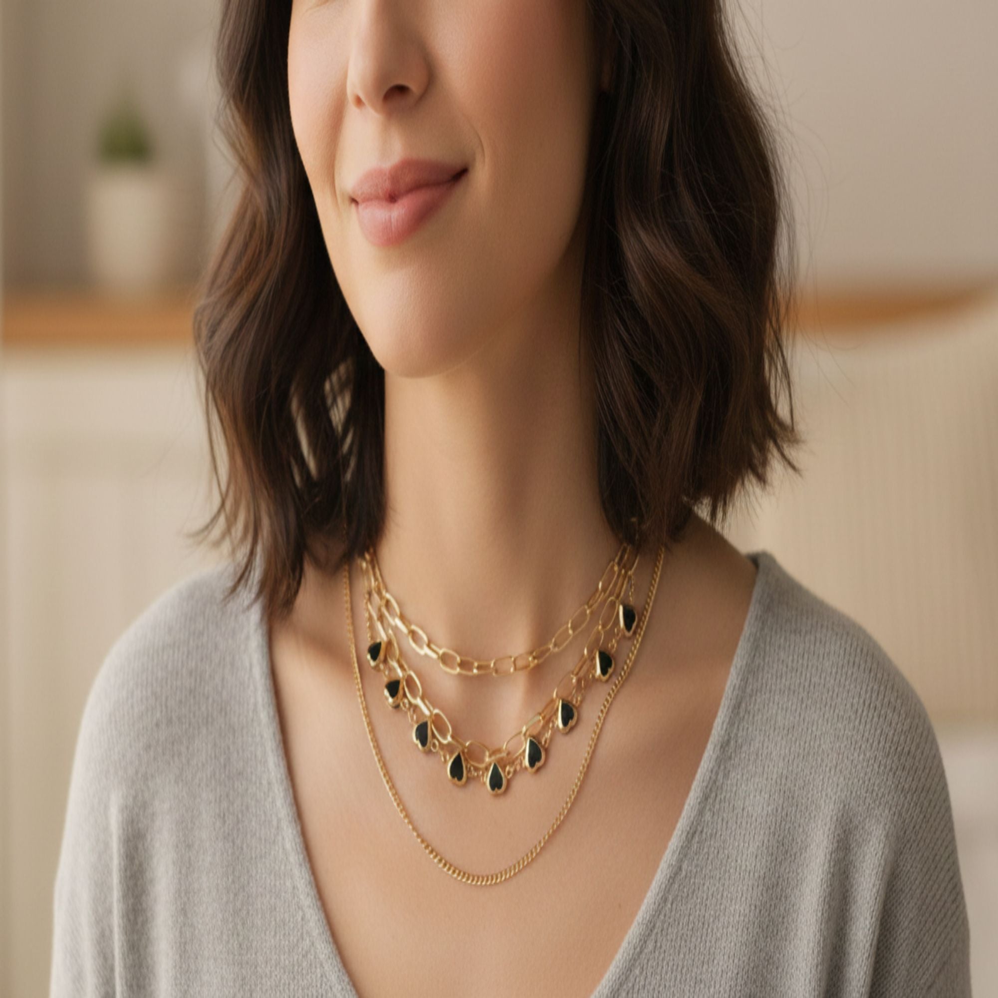 This necklace set combines three coordinated rose-gold chains into one piece, giving an effortless layered effect without needing to style separate necklaces. The black heart charms add contrast and a chic, romantic vibe that stands out against both light and dark outfits.