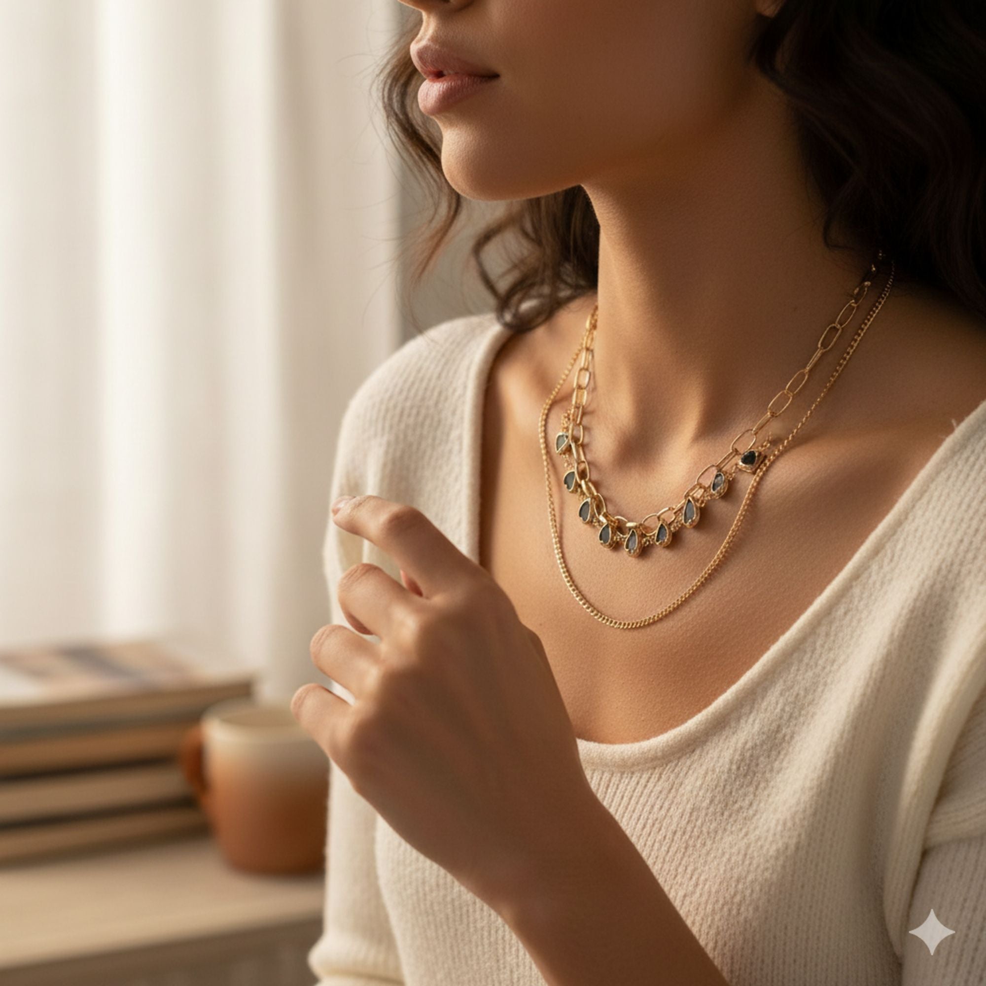 - Elegant three-layer necklace set in a rose-gold tone for a ready-made stacked look.