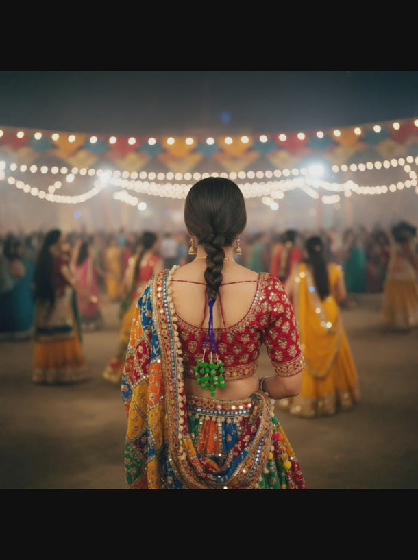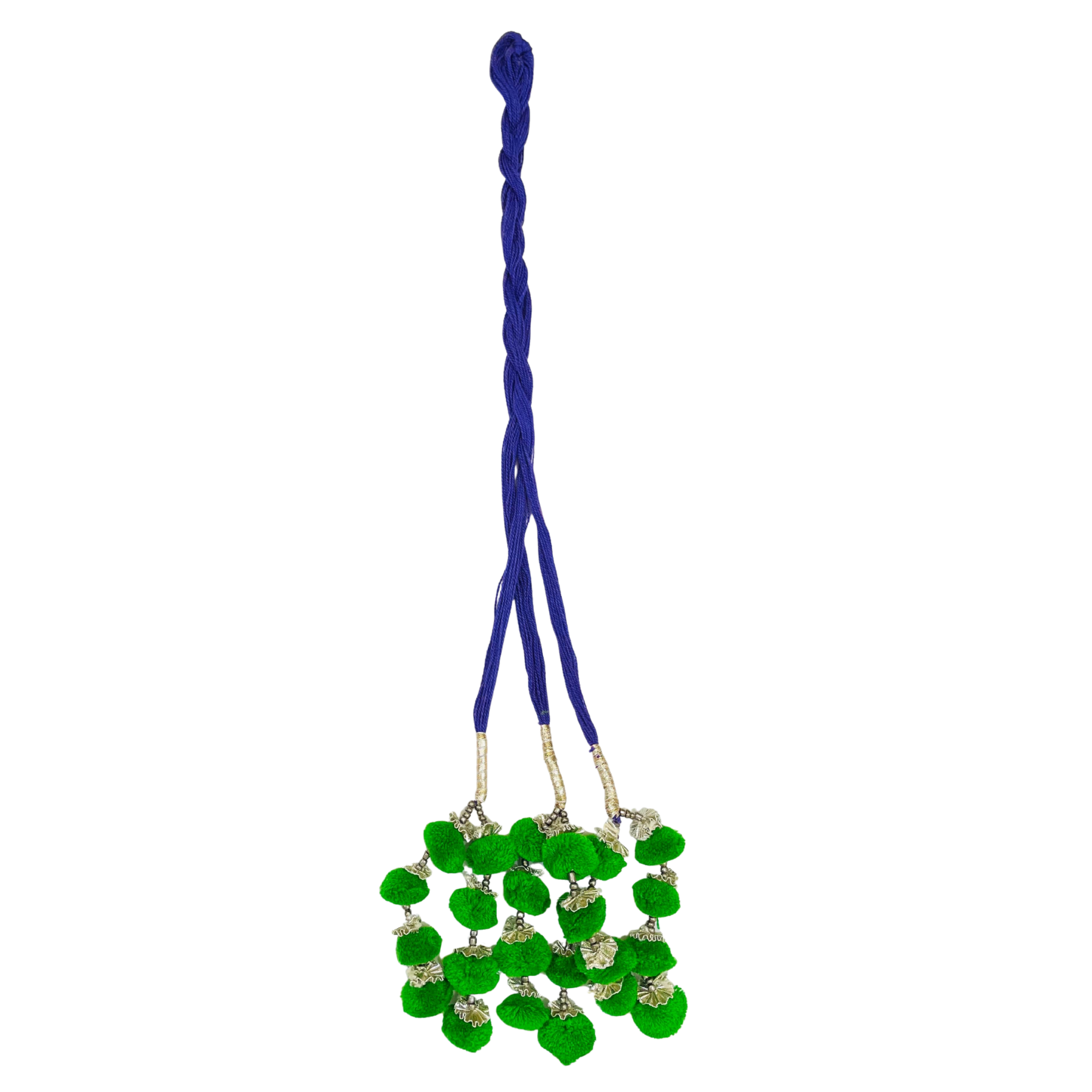 This Parandi features bright green woolen pom-pom tassels combined with blue twisted threads and silver-toned embellishments to celebrate Punjabi tradition. Worn by women and girls to adorn braids, it is an essential accessory for weddings, traditional rituals, and cultural performances. Its handcrafted design ensures each piece is unique, making it a standout addition to ethnic jewelry sets. The soft material feels comfortable against the scalp and blends seamlessly with thick or thin hair. Simple to use and easy to maintain, this Parandi brings joy and elegance to any occasion.
