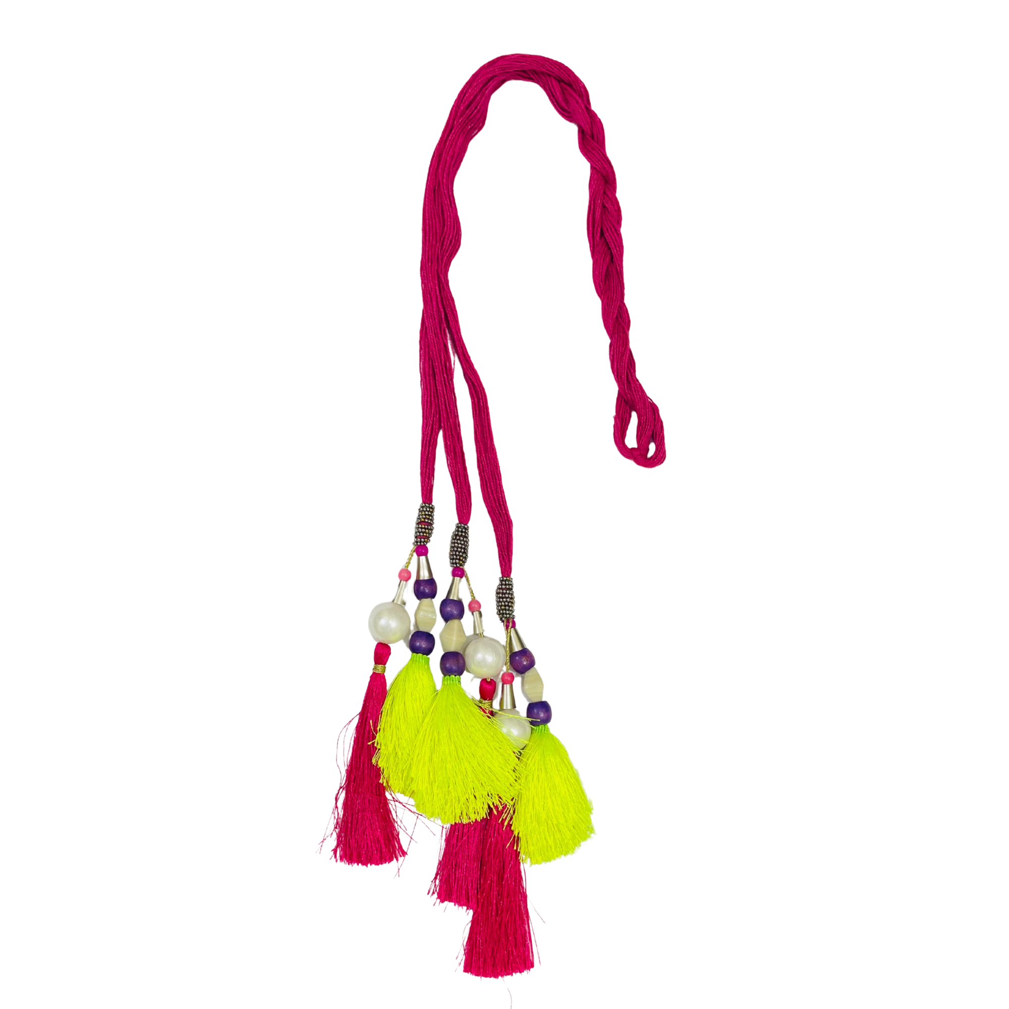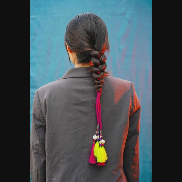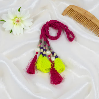 This Punjabi Parandi hair accessory brings vibrant color and ethnic charm to any braid. Handcrafted by artisans, it showcases vivid pink and yellow tassels accented with decorative beads for a striking traditional look. The soft cotton threads ensure gentle braiding and comfortable wear, making it suitable for long hours during weddings or festive occasions. This versatile parandi complements ethnic and fusion outfits, letting wearers celebrate cultural heritage with style. Ideal for women and girls of all ages.