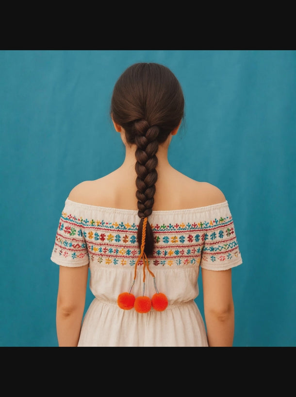 This traditional Punjabi Parandi is designed to complement ethnic styles and is commonly worn with suits and lehengas during special occasions. The product features a vibrant orange braided thread enhanced with three pom pom tassels, providing both a festive and playful accent to any hairstyle. Crafted with high-quality materials, the Parandi is comfortable, easy to braid into hair, and suitable for all-day wear. Ideal for weddings, family gatherings, dance performances, and gifting purposes, this accessory brings an authentic Punjabi touch to your look.