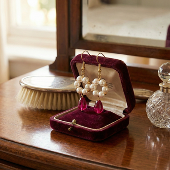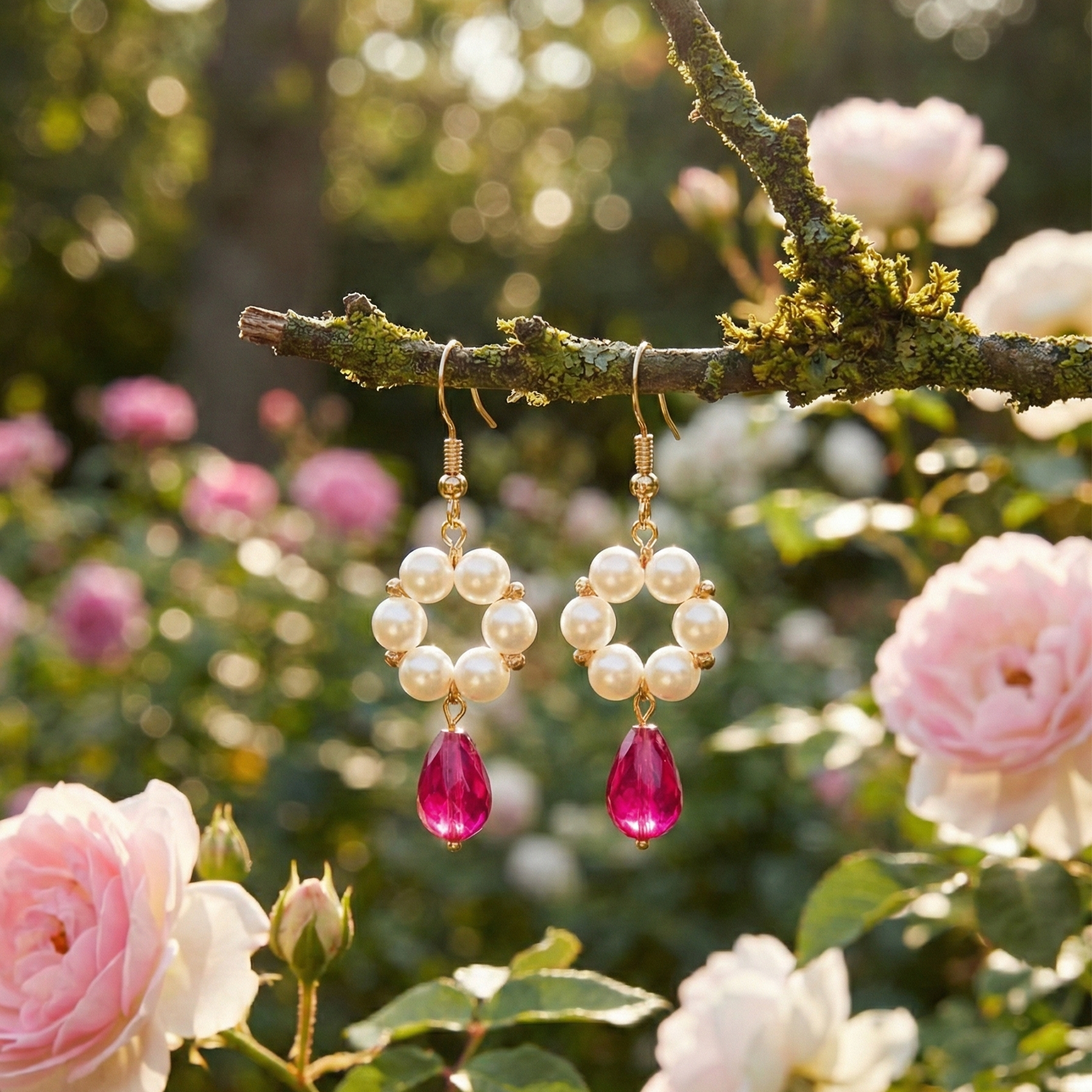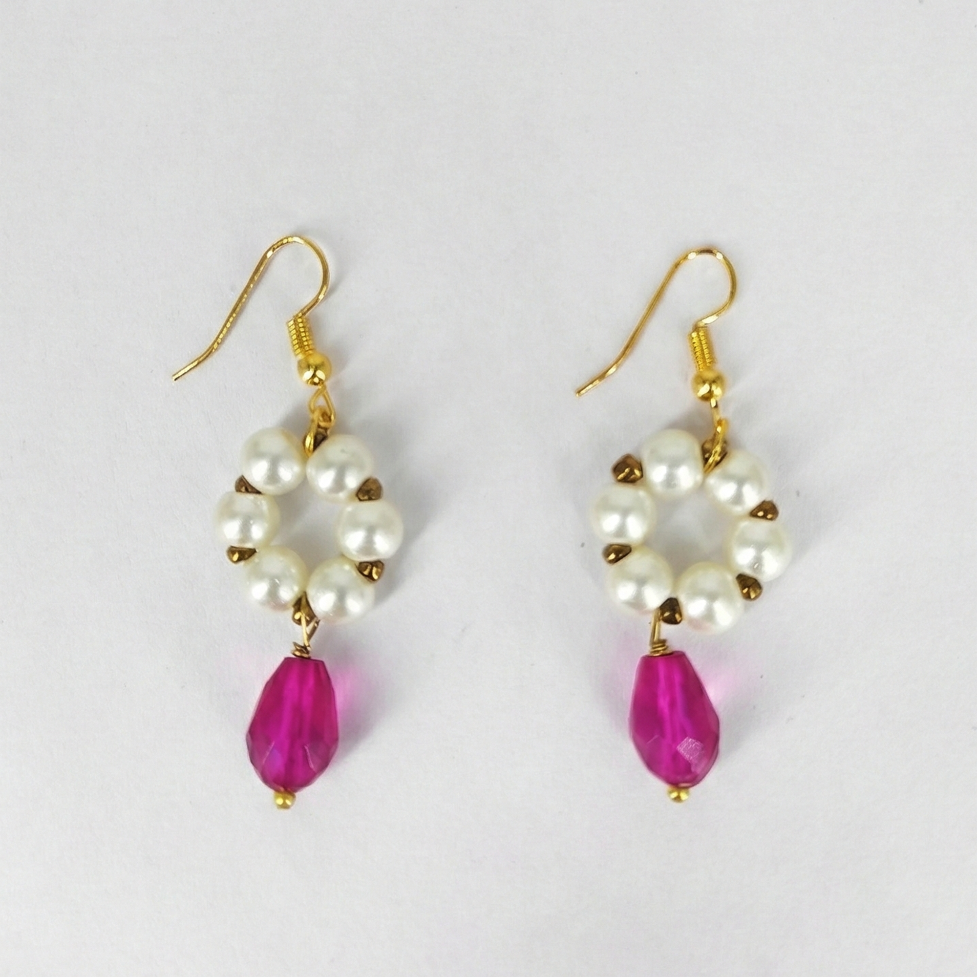 Handcrafted drop earrings with a circular arrangement of small white pearls forming a hoop, interspersed with metallic gold beads for contrast, suspended from gold-toned hooks, and finished with a vibrant pink teardrop gemstone dangling below. Ideal for ethnic, fusion, or daily wear, offering a blend of classic pearl elegance and modern color pop. Suitable for most occasions like weddings, parties, or casual outings in India.