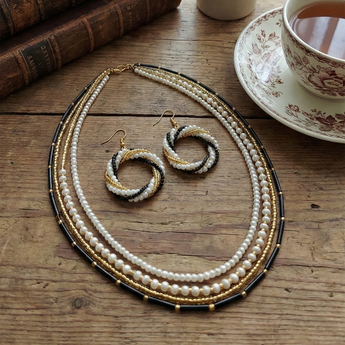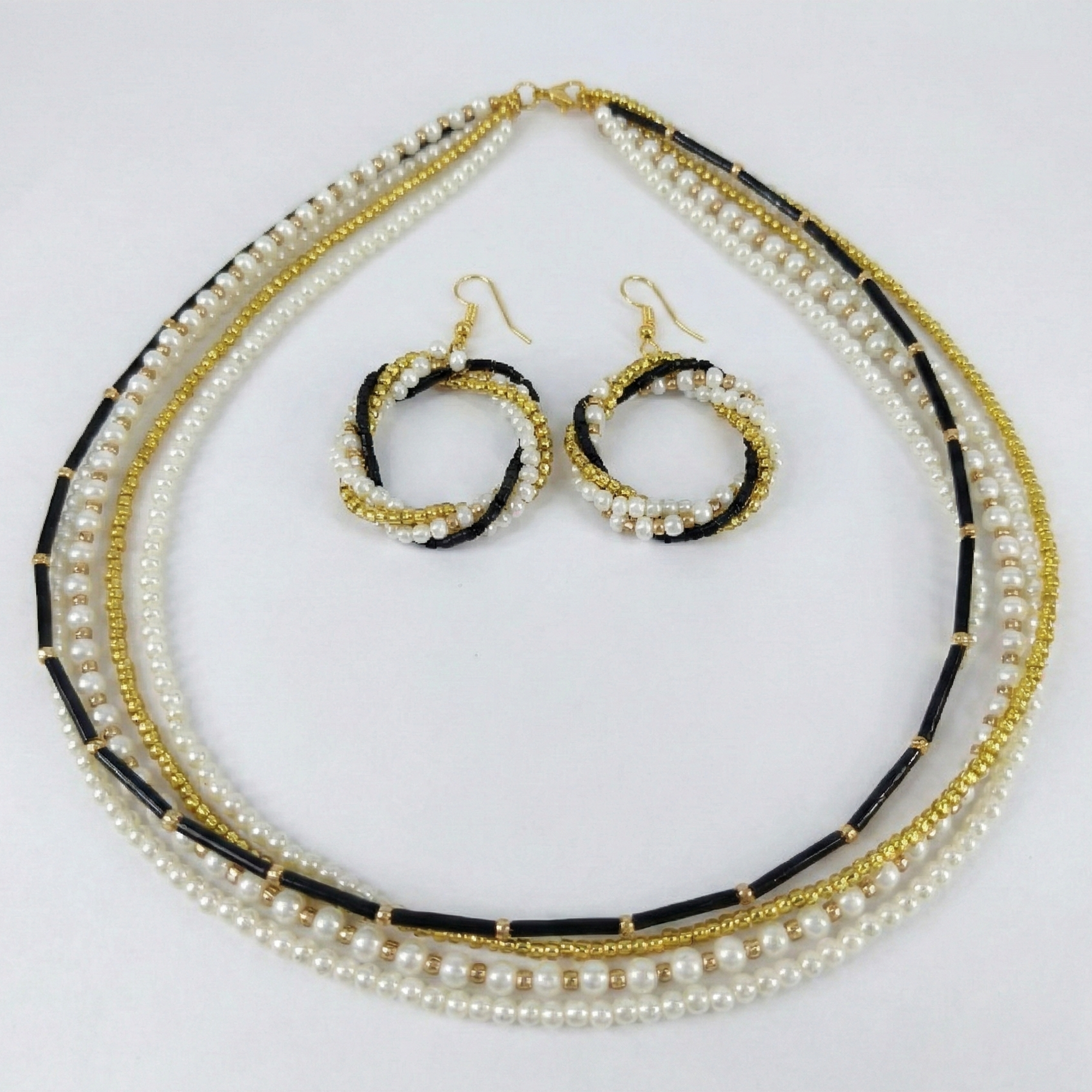 This stunning jewelry set features a necklace with three gracefully layered strands combining lustrous white pearls, sleek black beads, and shimmering gold-toned accents for a sophisticated boho-chic look. The matching earrings echo the design with a twisted loop of the same elements, dangling elegantly from gold hooks. Crafted for comfort and style, it's lightweight yet durable, perfect for layering or standalone glamour. Ideal for women seeking versatile pieces that blend traditional pearl elegance with modern edge. Handmade quality ensures unique appeal; store in a dry place to maintain shine.