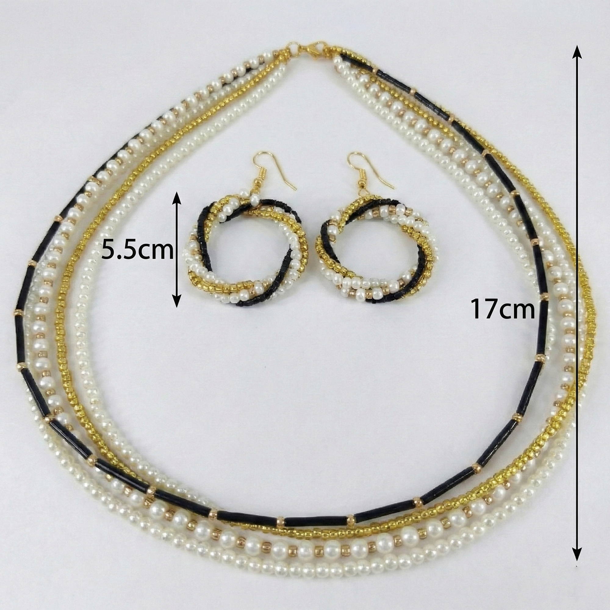 | Item Name | Elegant Three-Strand Pearl and Black Bead Necklace Earring Set in Gold Tone |