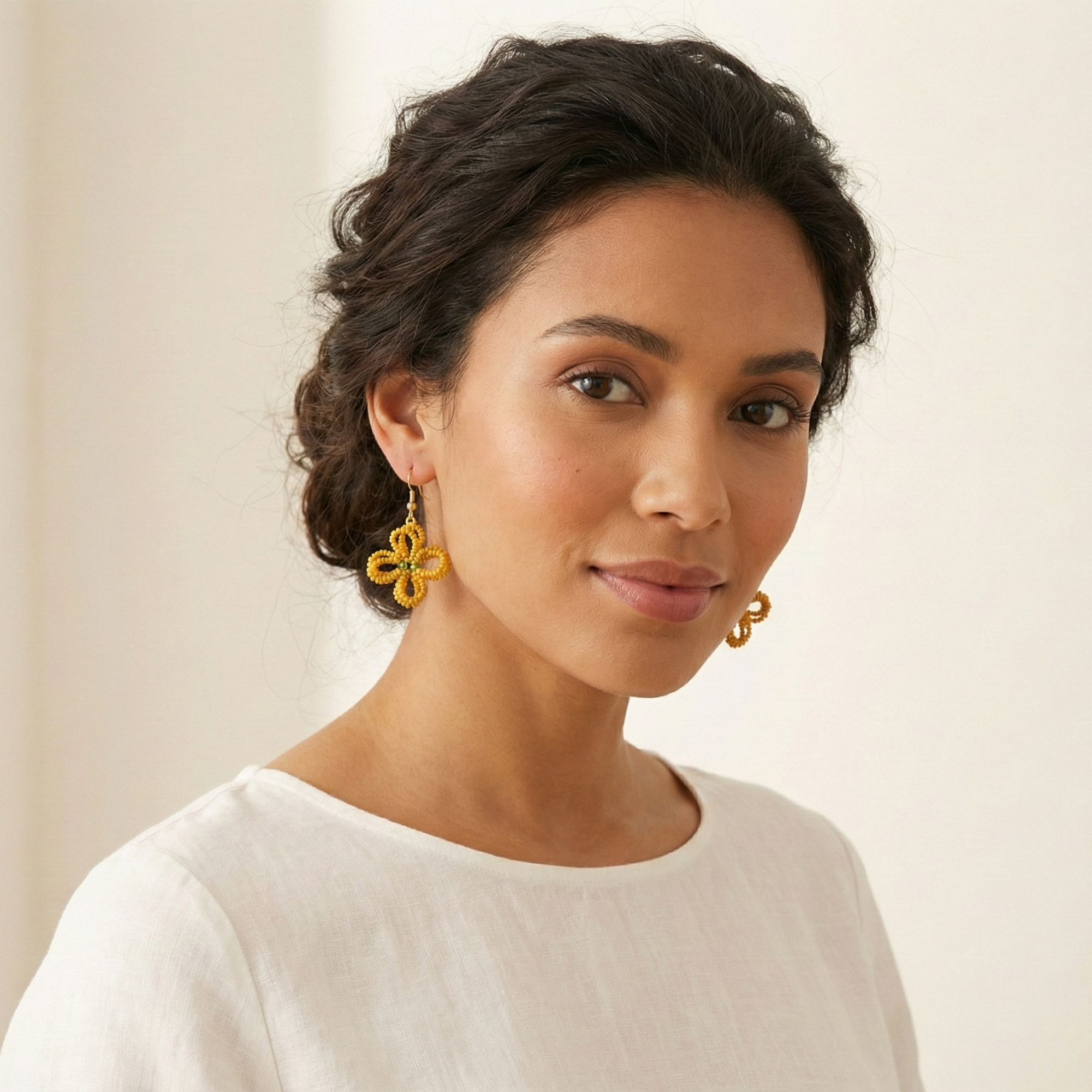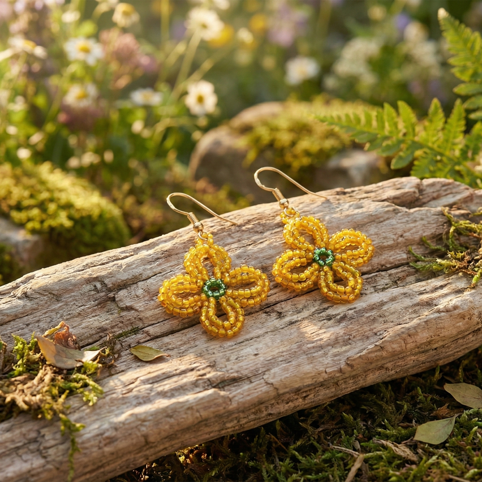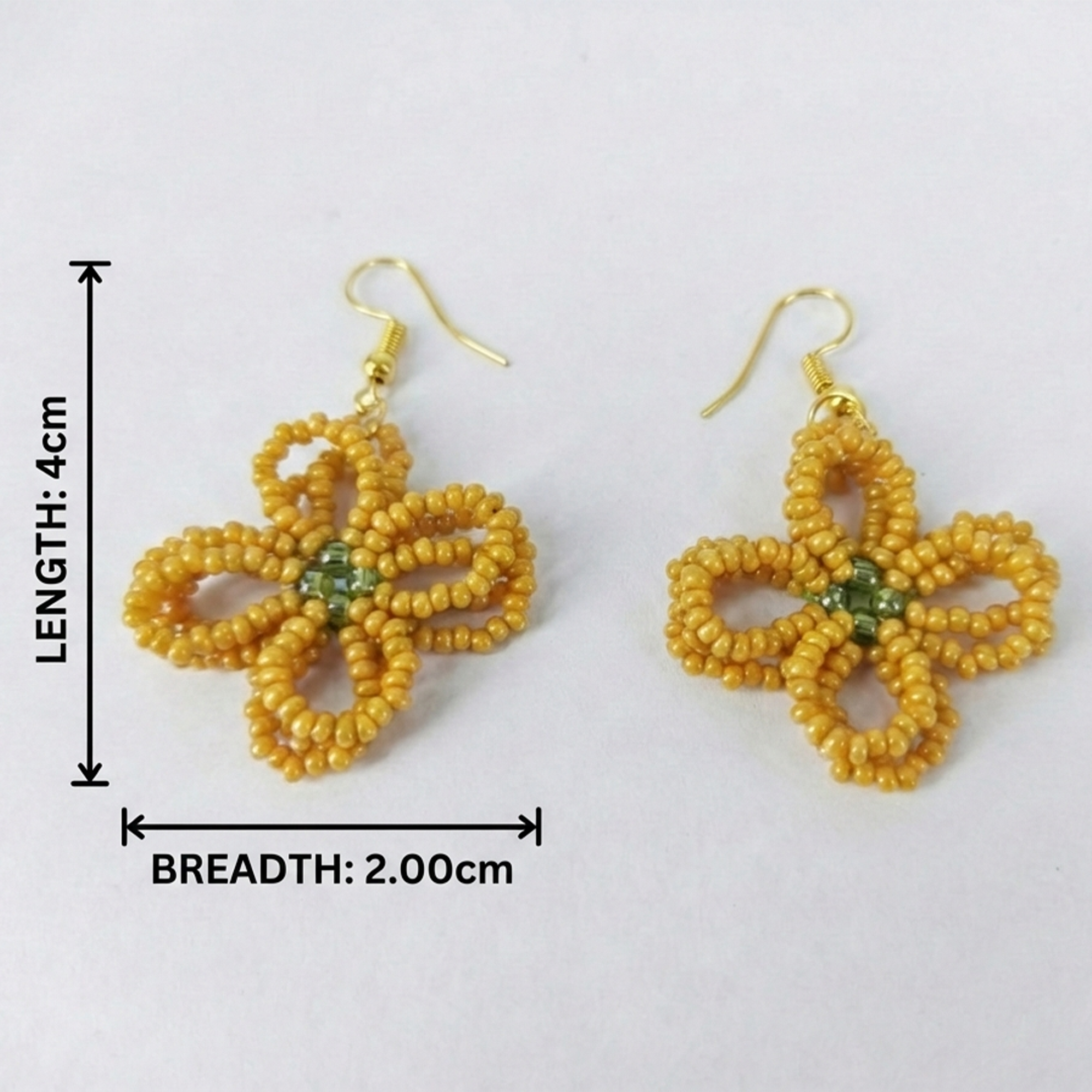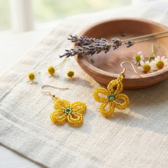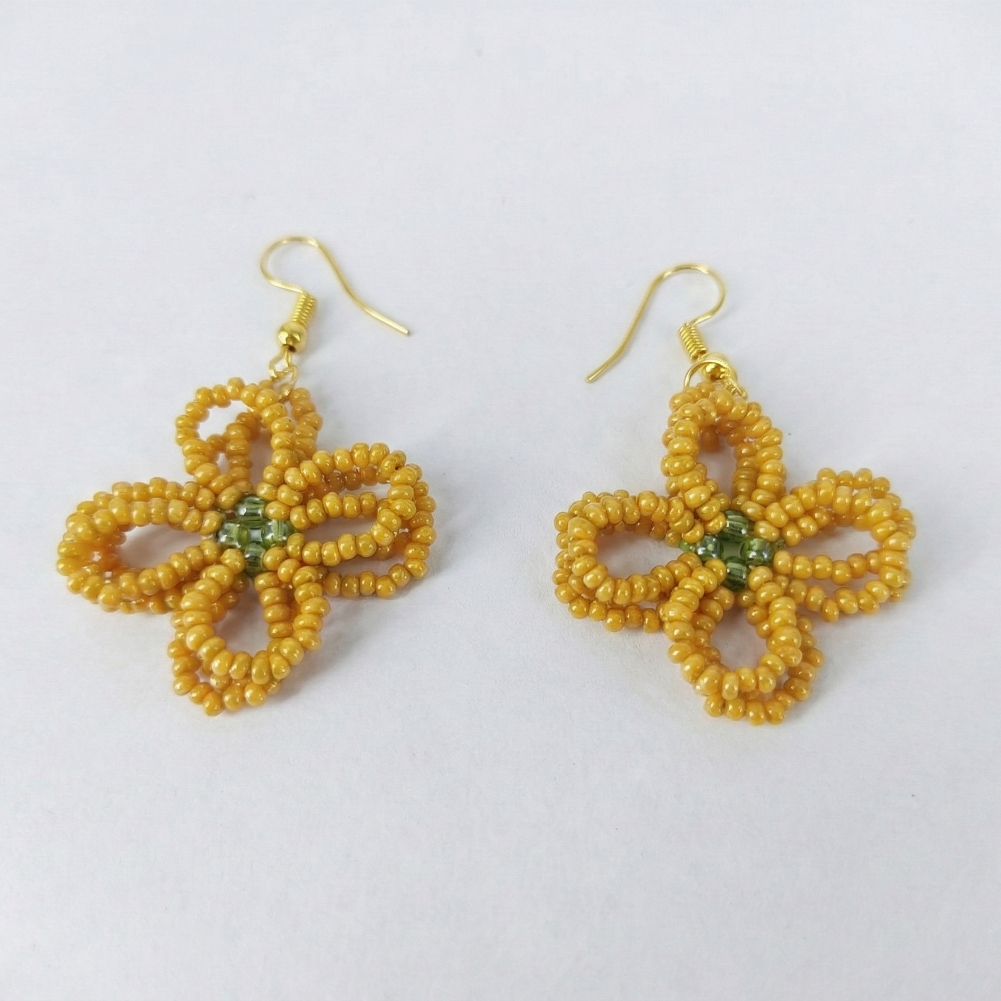 These stunning drop earrings feature intricate hand-knotted amber-colored glass seed beads forming delicate flower shapes, each centered with a small green stone for a pop of contrast. Dangling from slim gold-tone chains and secure hook findings, they offer a boho-chic vibe perfect for everyday wear or special occasions. Lightweight and hypoallergenic for most, they're ideal for adding warmth and texture to outfits. Proudly handcrafted, each pair may vary slightly in bead placement for a unique artisanal touch.