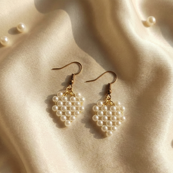 These elegant drop earrings feature a stunning diamond-shaped cluster made from dozens of tiny freshwater pearls woven into a net-like pattern, dangling gracefully from delicate gold-tone hooks. Handcrafted for a unique, bohemian vibe, they add a touch of sophistication to casual or formal outfits. Perfect for everyday wear or special occasions, the hypoallergenic metal ensures comfort, while the natural luster of the pearls catches the light beautifully. Ideal gift for women who love minimalist jewelry with artisanal charm.