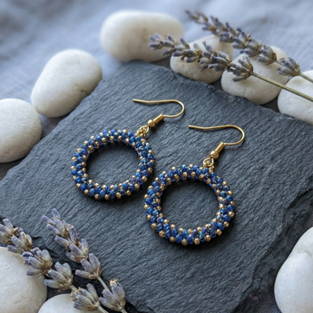 Item NameHandmade Blue Seed Bead Hoop Drop Earrings with Gold Hooks.