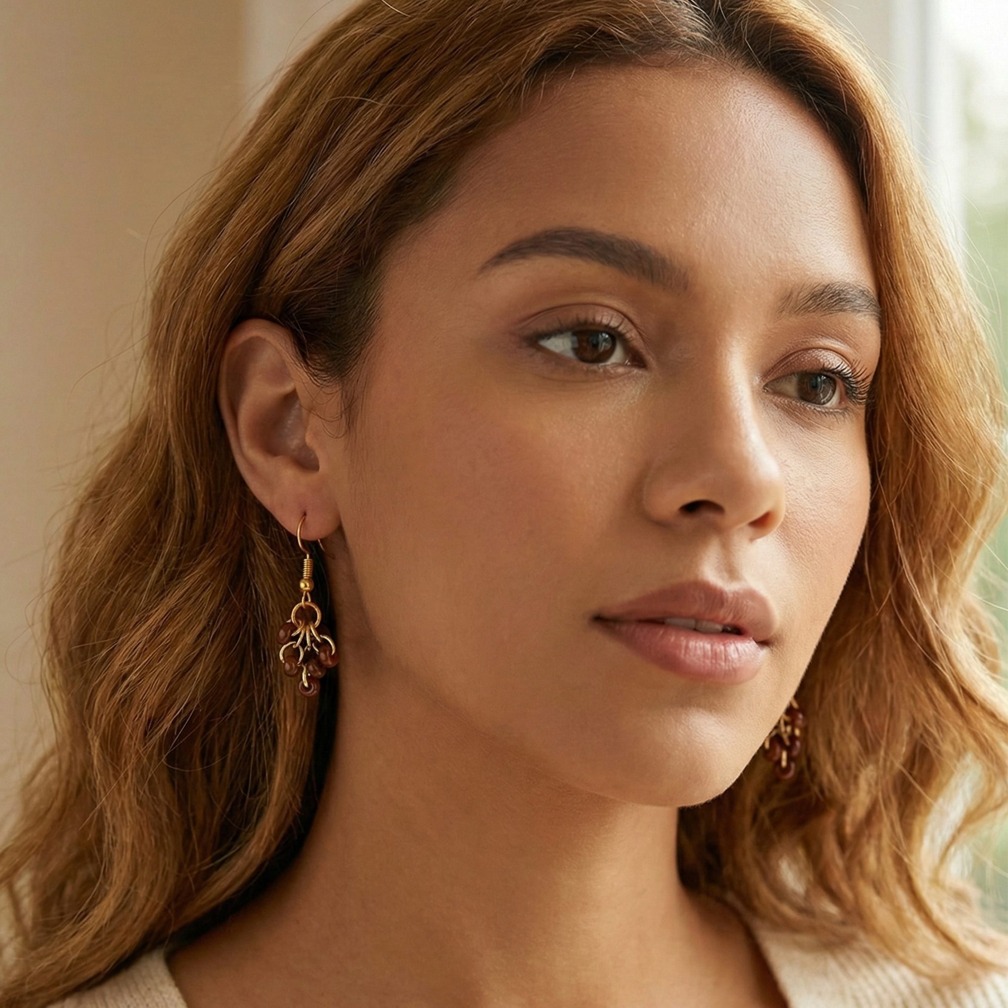 These elegant dangle earrings feature a charming grape-cluster design made with small maroon beads hanging from a gold-tone base. The lever-back hooks provide a secure and comfortable fit, making them suitable for all-day wear. Their lightweight construction ensures ease of use, while the rich maroon beads add a pop of color that pairs well with ethnic as well as western outfits. Ideal for casual outings, office wear, festive occasions, or as a small gift for loved ones, these earrings bring a playful yet classy touch to your jewelry collection.