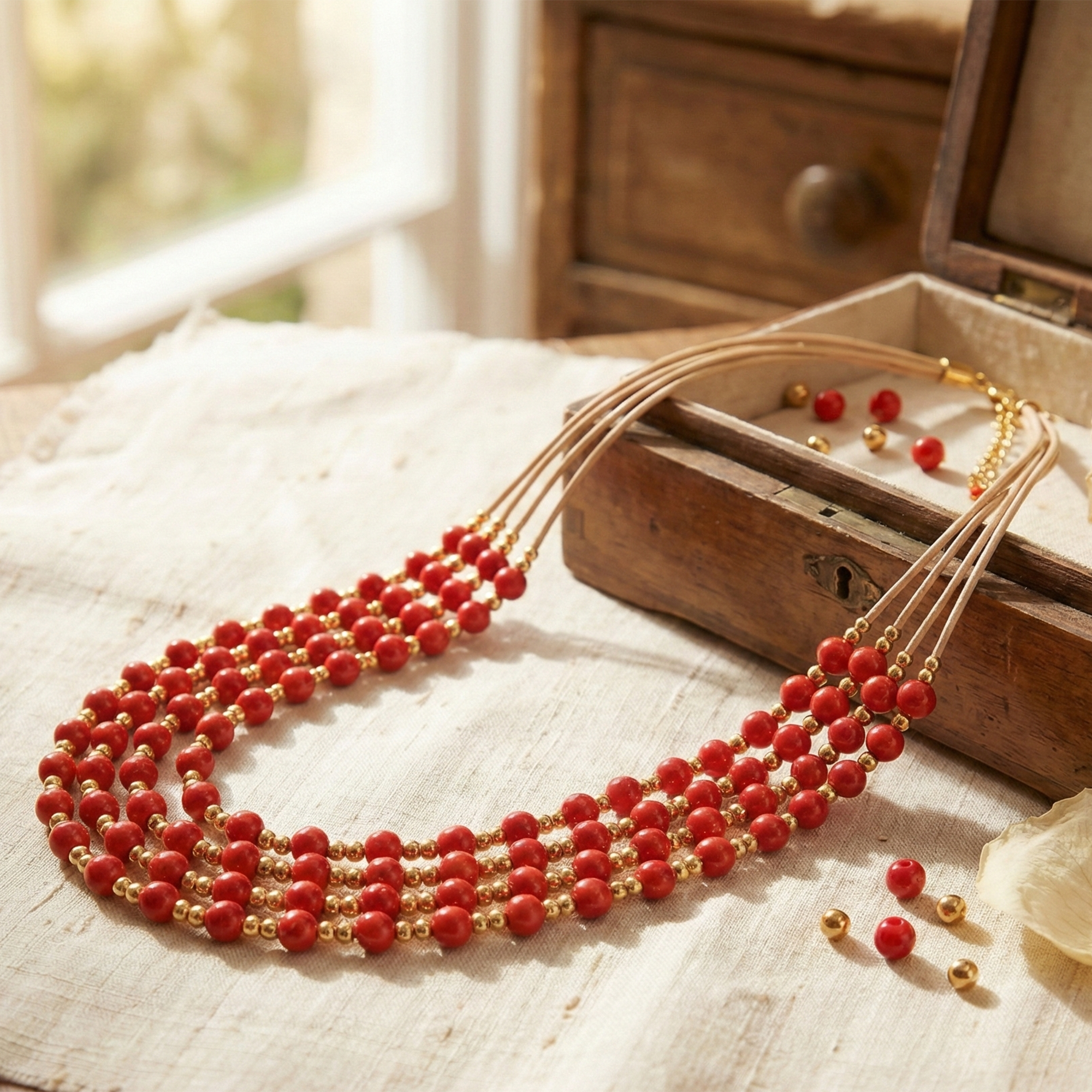 This elegant multi-layer red beaded necklace adds an instant festive touch to any outfit. Multiple strands of glossy red beads are artistically arranged to create a rich, layered look that frames the neckline beautifully. Lightweight and comfortable, it sits well on the neck without feeling too heavy, making it perfect for long events and celebrations. The golden-toned accents give it a traditional charm that pairs well with sarees, lehengas, kurtis, and even simple western dresses. Ideal as a gifting option for birthdays, anniversaries, weddings, and festive occasions.