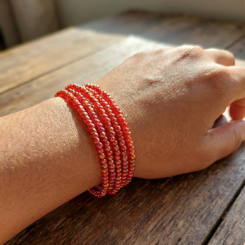 This stunning multi-strand bracelet features hundreds of tiny iridescent seed beads in a rich red hue that shifts from deep crimson to fiery orange-pink under light, creating a mesmerizing sparkle. Crafted with precision, the beads are strung on durable elastic cord, allowing it to slip easily over the wrist or wrap multiple times for a stacked look. Perfect for adding a pop of color to outfits, it's handmade-style jewelry that's both affordable and versatile. Hypoallergenic, nickel-free, and resistant to fading for long-lasting wear.