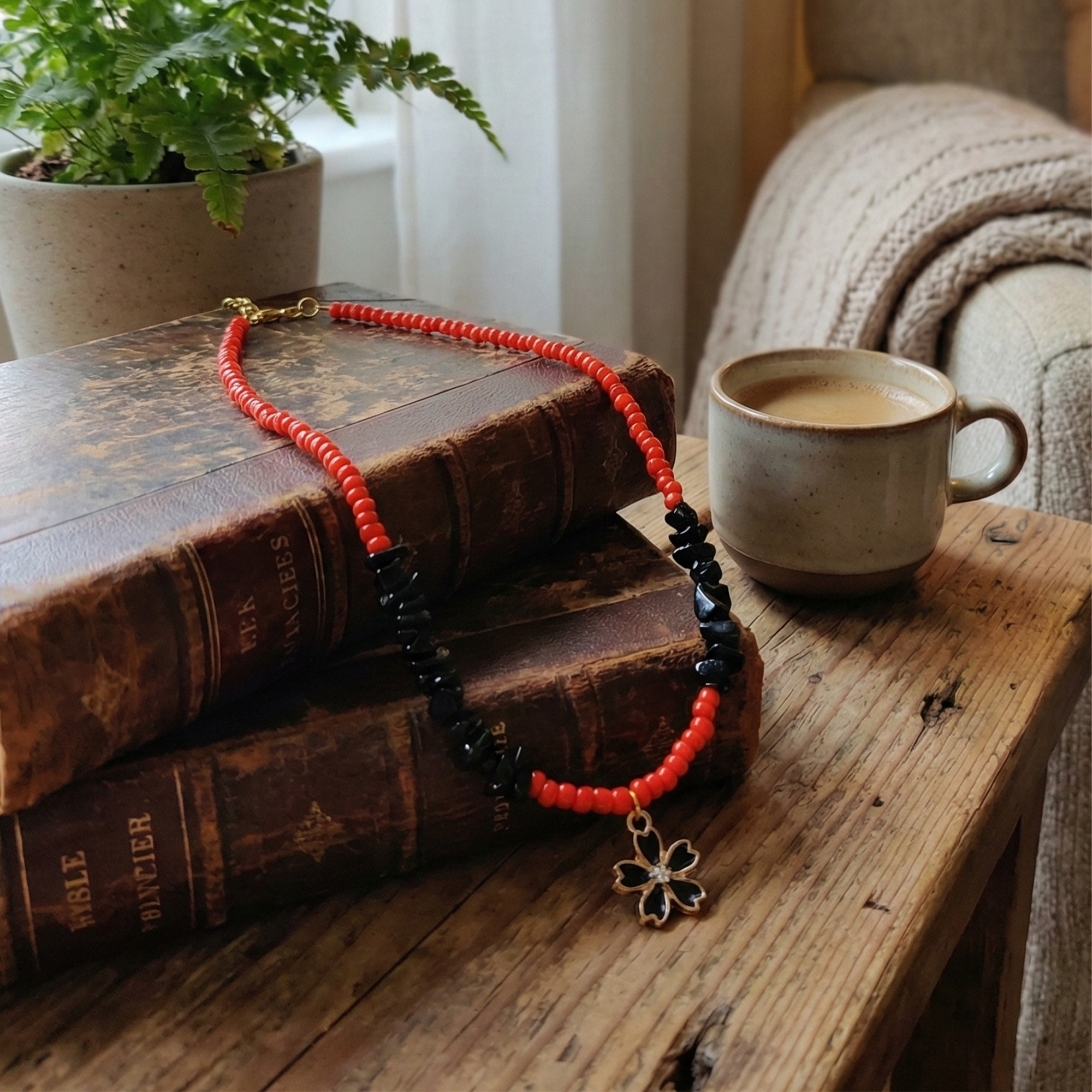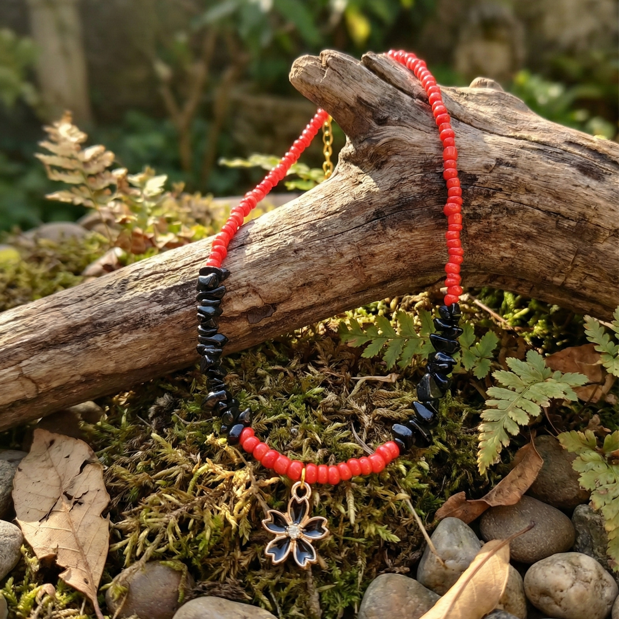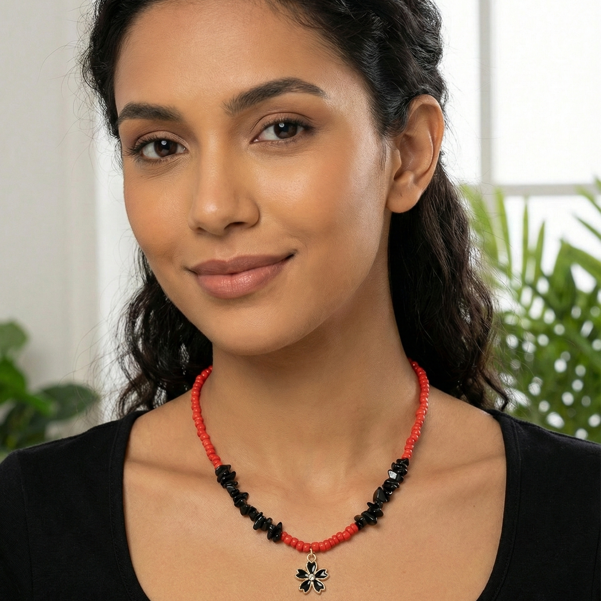 This handcrafted necklace blends vibrant red coral beads with sleek black onyx for a bold, contrasting look. The upper half features smooth, uniform red coral beads, transitioning seamlessly into textured black onyx chips at the bottom. A delicate flower pendant dangles from the center, adorned with tiny black onyx stones and a gold-tone frame for subtle elegance. Perfect for boho, ethnic, or everyday wear, it adds a pop of color and spiritual vibe—coral for vitality, onyx for protection. Ideal for festivals, casual outfits, or as a thoughtful gift.